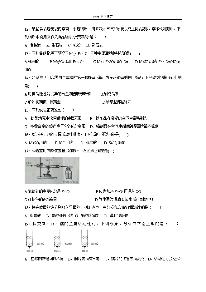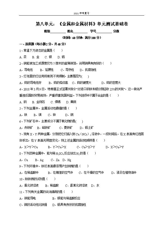 2021中考复习:人教版初中化学《第8单元 金属和金属材料》单元测试基础卷(原卷版)