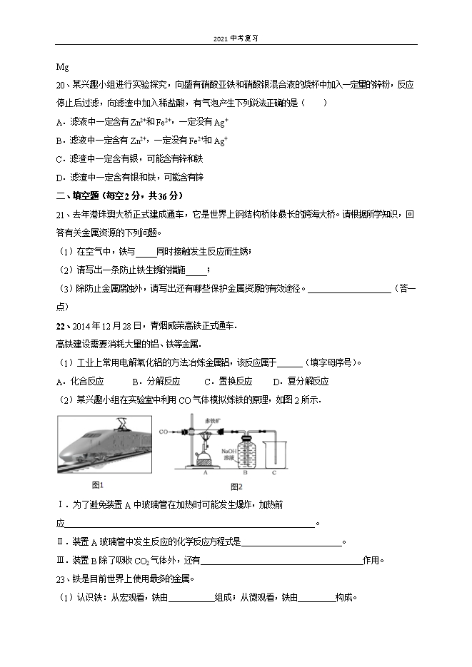 【内容简介】一、选择题(每小题2分,共40分)1、常温下为液态的金属是( )A. 汞 B. 金 C. 银 D. 铝2、铜能被加工成厚度仅为7微米的超薄铜箔,说明铜具有良好的( )A.导电性 B.延展性 C.导热性 D.抗腐蚀性3、灯泡里的灯丝用钨制而不用锡制,主要是因为( )A.钨的导电性好 B.钨的熔点高 C.钨的硬度大 D.钨的密度大4、2018年3月9日,特朗普正式签署关税令“对进口钢铁和铝分别征收25%的关税”,这一做法严重违反国际贸易规则,严重损害我国利益。下列选项中不属于合金的是( )A. 钢 B. 金刚石 C. 焊锡 D. 黄铜5、下列金属中,金属活动性最强的是( )A.铁 B.镁 C.锌 D.铜6、下列矿石中,主要成分不属于氧化物的是( )A.赤铁矿 B.磁铁矿 C.菱铁矿 D.铝土矿7、现有X、Y两种金属,分别把它们插入到 Cu(NO3)2溶液中,一段时间后,在X表面有红色固体析出,在Y表面无明显变化,则上述金属的活动性顺序是( )......