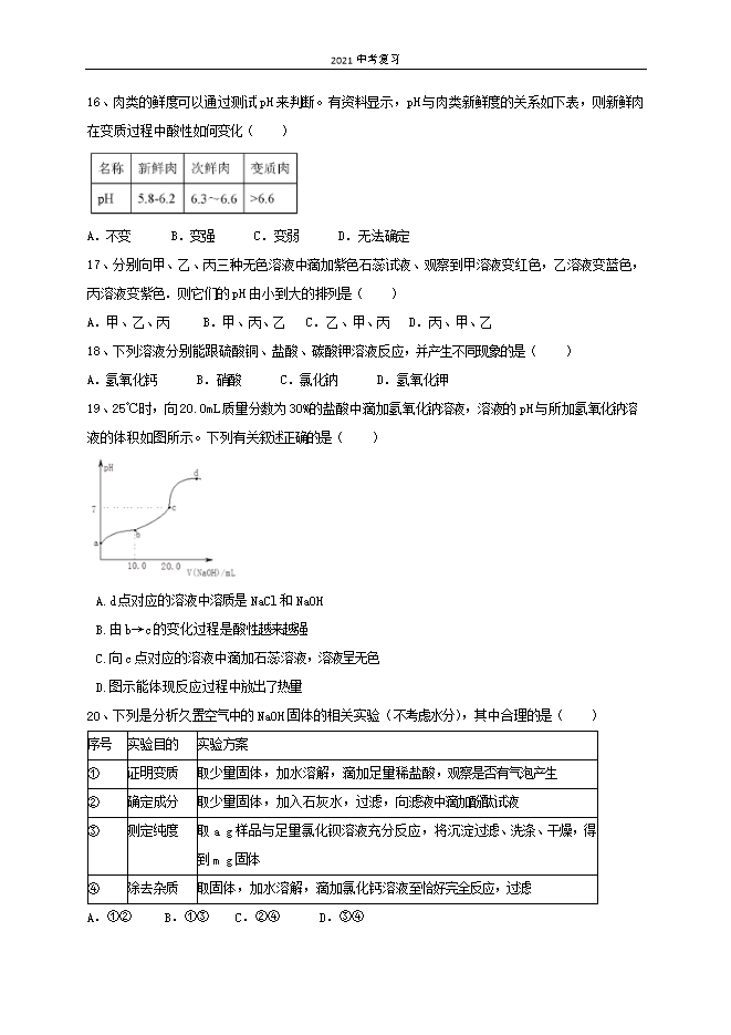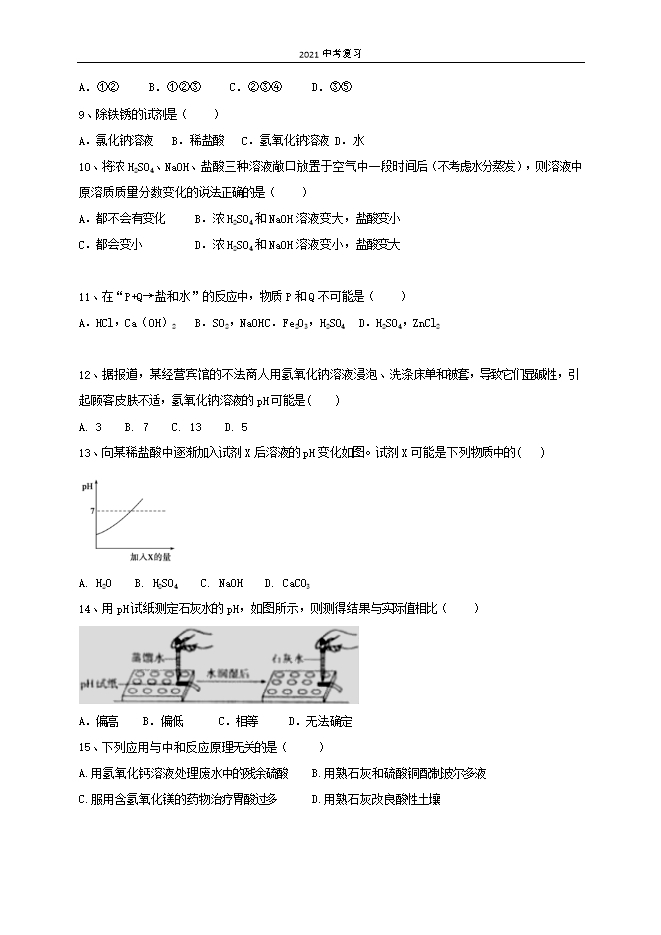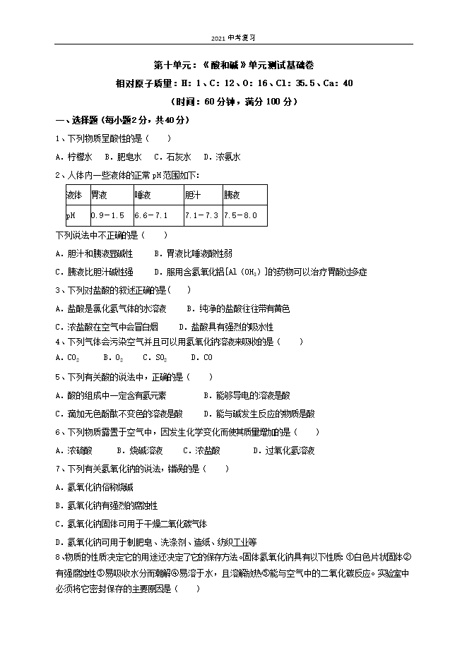 2021中考复习:人教版初中化学《第10单元 酸和碱》单元测试基础卷(原卷版)