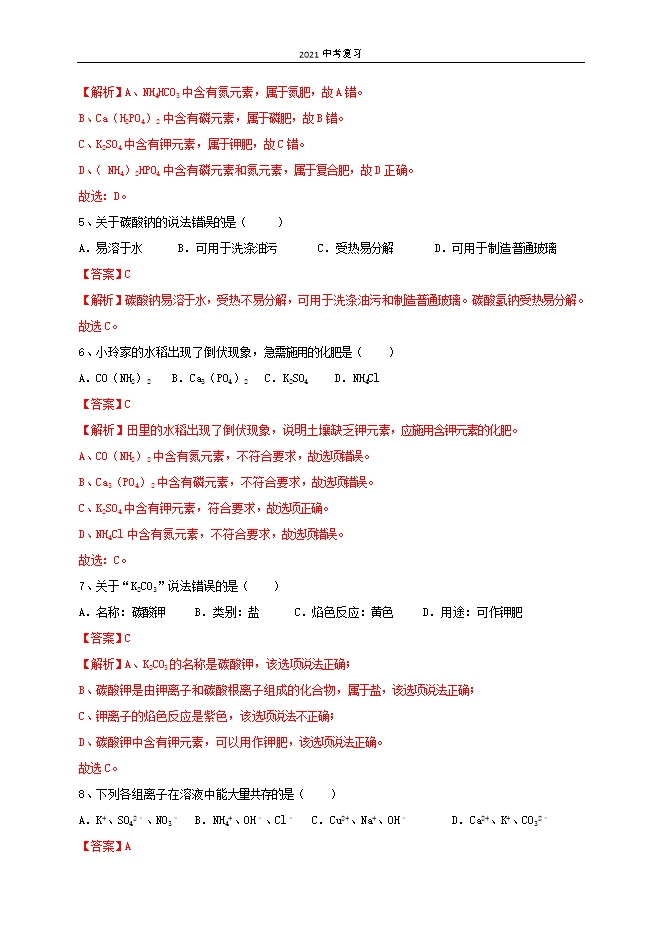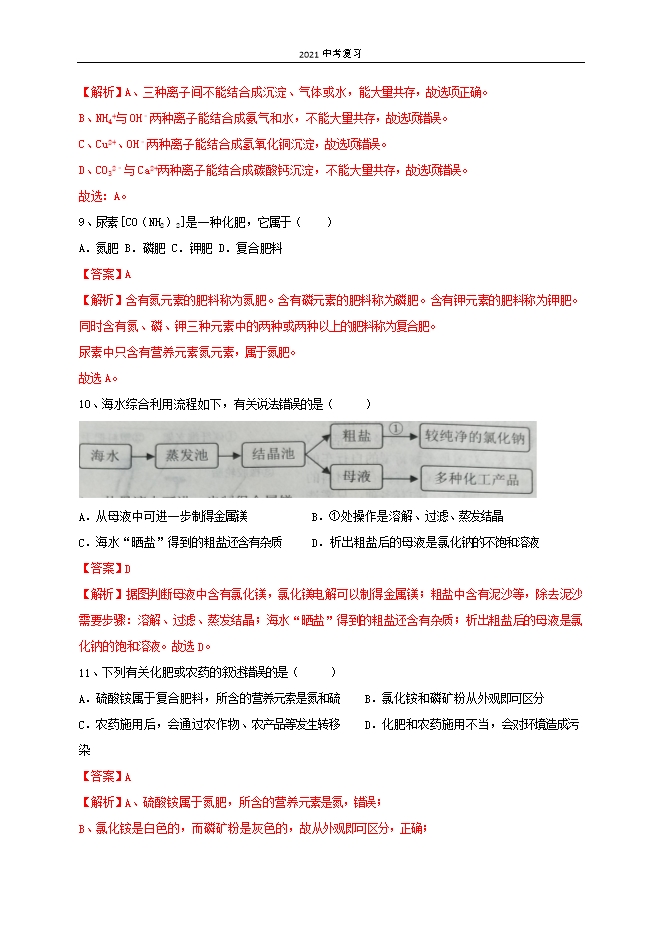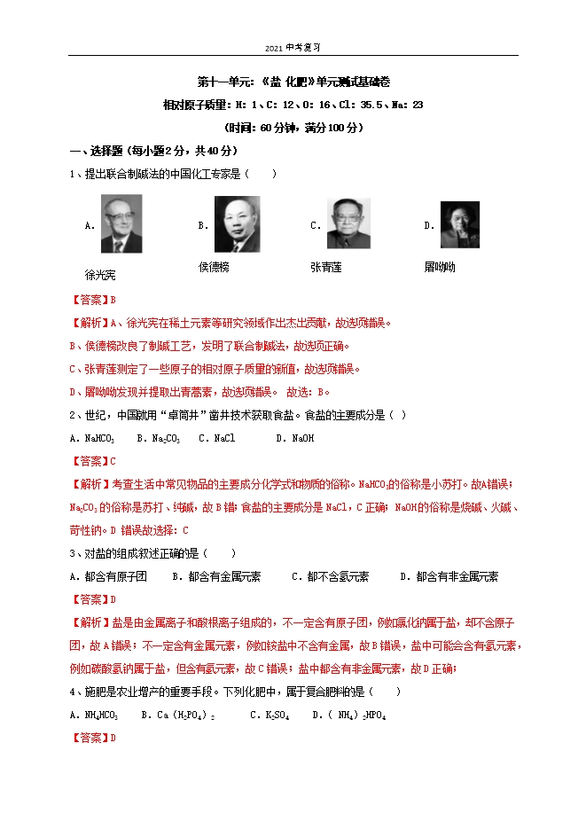 【内容简介】第十一单元:《盐 化肥》单元测试基础卷相对原子质量:H:1、C:12、O:16、Cl:35.5、Na:23(时间:60分钟,满分100分)一、选择题(每小题2分,共40分)1、提出联合制碱法的中国化工专家是( )A. 徐光宪B. 侯德榜C. 张青莲D. 屠呦呦【答案】B【解析】A、徐光宪在稀土元素等研究领域作出杰出贡献,故选项错误。 B、侯德榜改良了制碱工艺,发明了联合制碱法,故选项正确。 C、张青莲测定了一些原子的相对原子质量的新值,故选项错误。 D、屠呦呦发现并提取出青蒿素,故选项错误。 故选:B。2、世纪,中国就用“卓筒井”凿井技术获取食盐。食盐的主要成分是()A.NaHCO3 B.Na2CO3 C.NaCl D.NaOH【答案】C【解析】考查生活中常见物品的主要成分化学式和物质的俗称。NaHCO3 的俗称是小苏打。故 A 错误;Na2CO3 的俗称是苏打、纯碱,故 B 错;食盐的主要成分是 NaCl,C 正确; NaOH 的俗称是烧碱、火碱、苛性钠。D 错误故选择:C3、对盐的组成叙述正确的是( )A.都含有原子团 B.都含有金属元素 C.都不含氢元素 D.都含有非金属元素【答案】D【解析】盐是由金属离子和酸根离子组成的,不一定含有原子团,例如氯化钠属于盐,却不含原子团,故A错误;不一定含有金属元素,例如铵盐中不含有金属,故B错误,盐中可能会含有 氢元素,例如碳酸氢钠属于盐,但含有氢元素,故C错误;盐中都含有非金属元素,故D正确;......