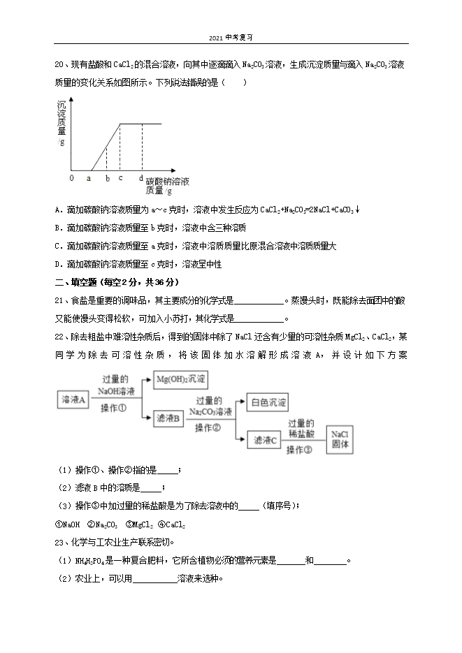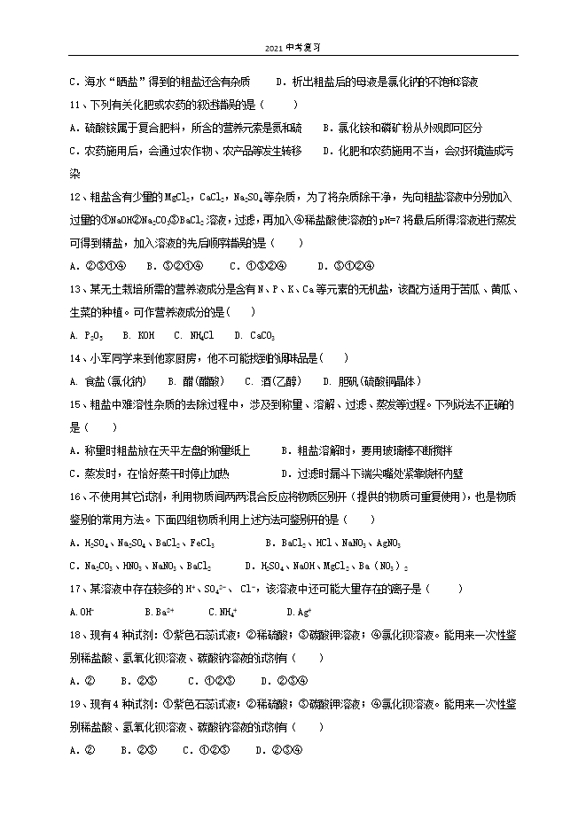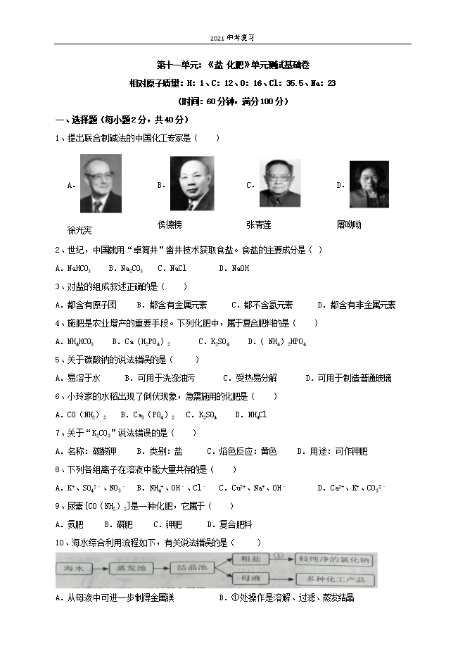 2021中考复习:人教版初中化学《第11单元 盐 化肥》单元测试基础卷(原卷版)