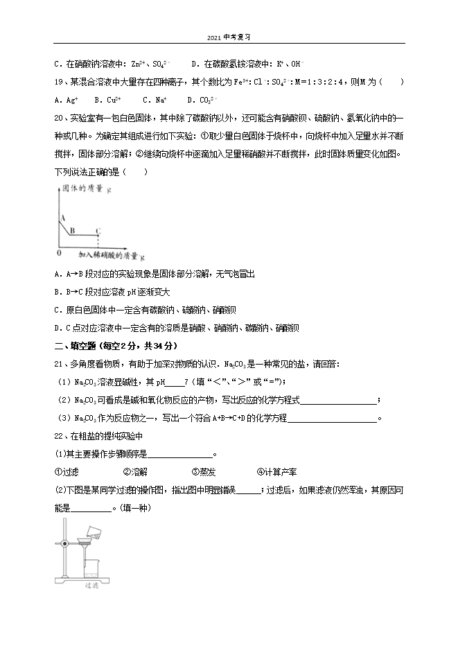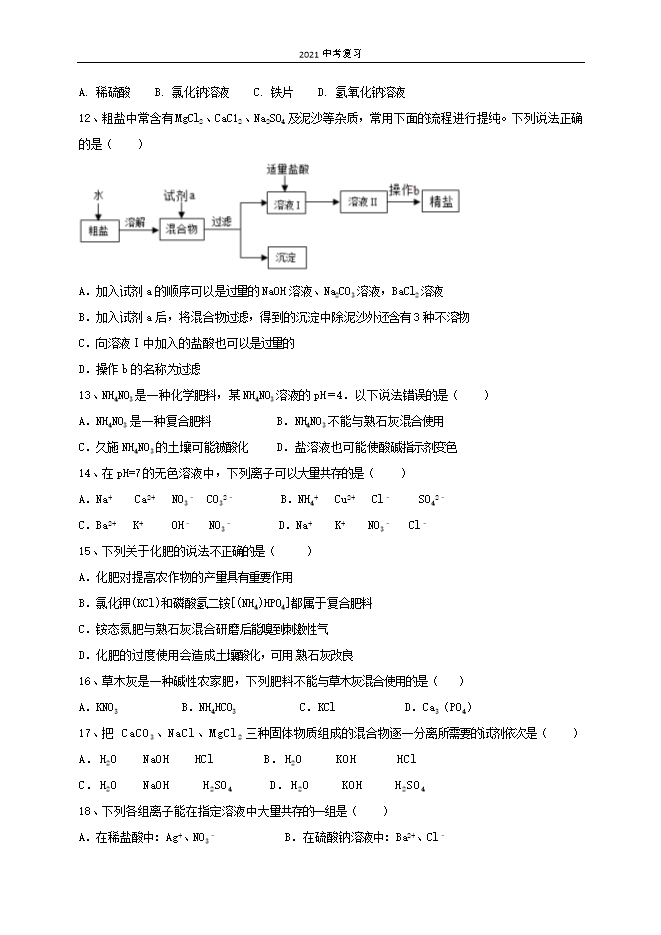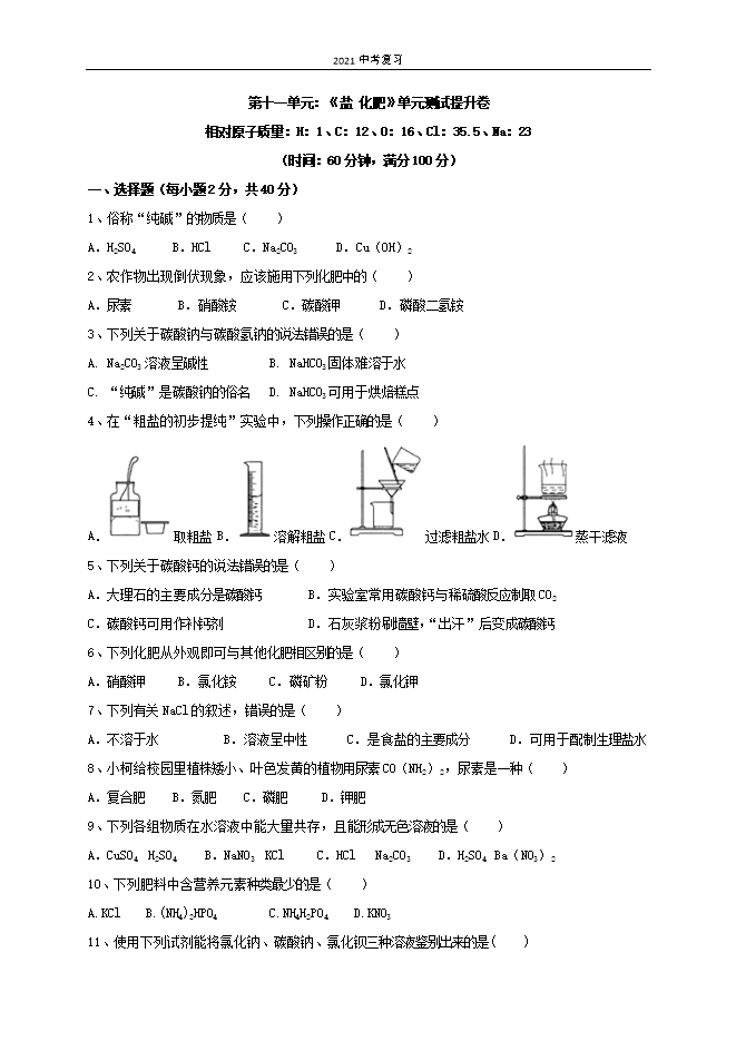 【内容简介】第十一单元:《盐 化肥》单元测试提升卷相对原子质量:H:1、C:12、O:16、Cl:35.5、Na:23(时间:60分钟,满分100分)一、选择题(每小题2分,共40分)1、俗称“纯碱”的物质是( )A.H2SO4 B.HCl C.Na2CO3 D.Cu(OH)22、农作物出现倒伏现象,应该施用下列化肥中的( )A.尿素 B.硝酸铵 C.碳酸钾 D.磷酸二氢铵3、下列关于碳酸钠与碳酸氢钠的说法错误的是( )A. Na2CO3溶液呈碱性 B. NaHCO3固体难溶于水C. “纯碱”是碳酸钠的俗名D. NaHCO3可用于烘焙糕点4、在“粗盐的初步提纯”实验中,下列操作正确的是( )A. 取粗盐B. 溶解粗盐C. 过滤粗盐水D. 蒸干滤液5、下列关于碳酸钙的说法错误的是( )A.大理石的主要成分是碳酸钙 B.实验室常用碳酸钙与稀硫酸反应制取CO2C.碳酸钙可用作补钙剂 D.石灰浆粉刷墙壁,“出汗”后变成碳酸钙6、下列化肥从外观即可与其他化肥相区别的是( )A.硝酸钾 B.氯化铵 C.磷矿粉 D.氯化钾7、下列有关NaCl的叙述,错误的是( )A.不溶于水 B.溶液呈中性 C.是食盐的主要成分 D.可用于配制生理盐水8、小柯给校园里植株矮小、叶色发黄的植物用尿素CO(NH2)2,尿素是一种( )A.复合肥 B.氮肥 C.磷肥 D.钾肥9、下列各组物质在水溶液中能大量共存,且能形成无色溶液的是( )A.CuSO4 H2SO4 B.NaNO3 KCl C.HCl Na2CO3 D.H2SO4 Ba(NO3)2......