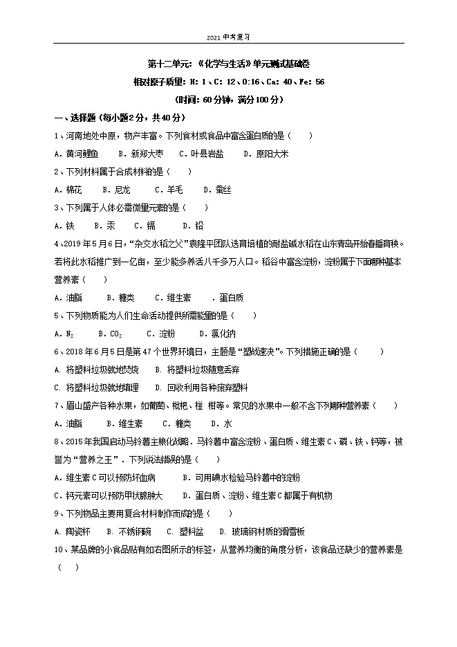 【内容简介】第十二单元:《化学与生活》单元测试基础卷相对原子质量:H:1、C:12、O:16、Ca:40、Fe:56(时间:60分钟,满分100分)一、选择题(每小题2分,共40分)1、河南地处中原,物产丰富。下列食材或食品中富含蛋白质的是( )A.黄河鲤鱼 B.新郑大枣 C.叶县岩盐 D.原阳大米2、下列材料属于合成材料的是( )A.棉花 B.尼龙 C.羊毛 D.蚕丝3、下列属于人体必需微量元素的是( )A.铁 B.汞 C.镉 D.铅4、2019年5月6日,“杂交水稻之父”袁隆平团队选育培植的耐盐碱水稻在山东青岛开始春播育秧。若将此水稻推广到一亿亩,至少能多养活八千多万人口。稻谷中富含淀粉,淀粉属于下面哪种基本营养素( )A.油脂 B.糖类 C.维生素 .蛋白质5、下列物质能为人们生命活动提供所需能量的是( )A.N2 B.CO2 C.淀粉 D.氯化钠6、2018年6月5日是第47个世界环境日,主题是“塑战速决”。下列措施正确的是( )A. 将塑料垃圾就地焚烧 B. 将塑料垃圾随意丢弃C. 将塑料垃圾就地填埋 D. 回收利用各种废弃塑料7、眉山盛产各种水果,如葡萄、枇杷、椪 柑等。常见的水果中一般不含下列哪种营养素( )A.油脂 B.维生素 C.糖类 D.水8、2015年我国启动马铃薯主粮化战略.马铃薯中富含淀粉、蛋白质、维生素C、磷、铁、钙等,被誉为“营养之王”.下列说法错误的是( )......