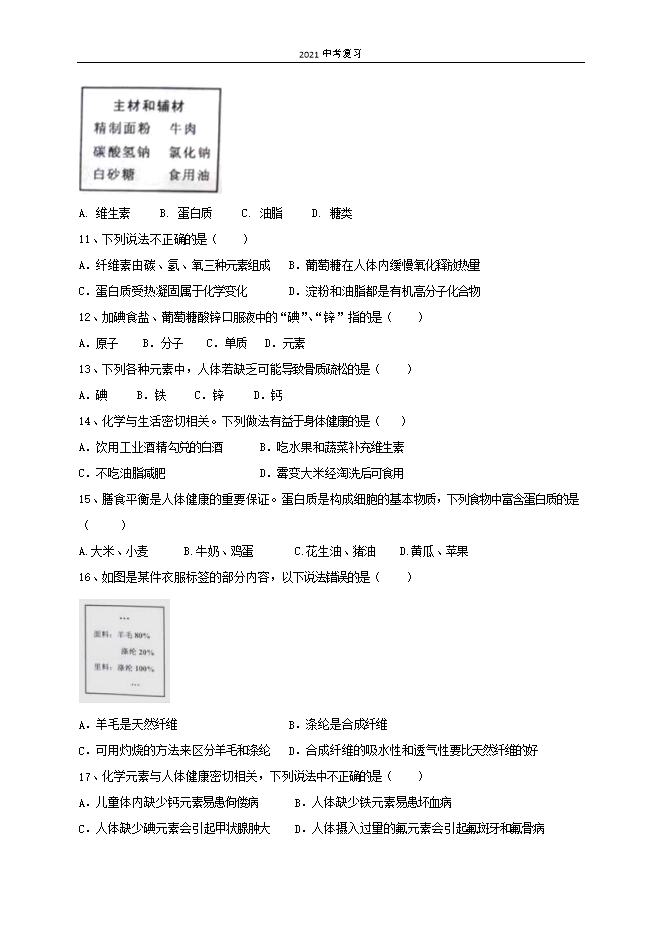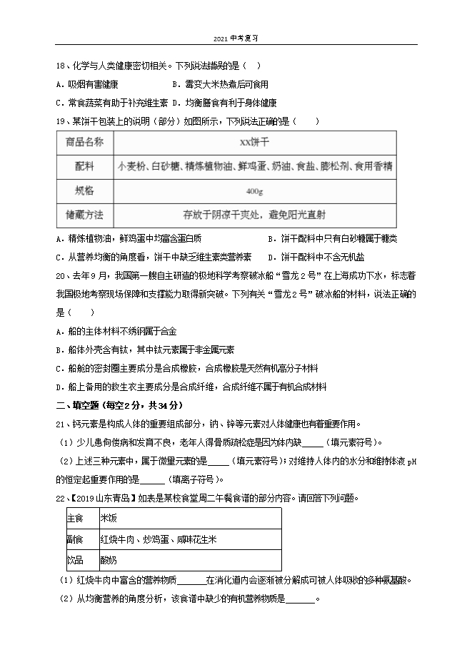 2021中考复习:人教版初中化学《第12单元 化学与生活》单元测试基础卷(原卷版)