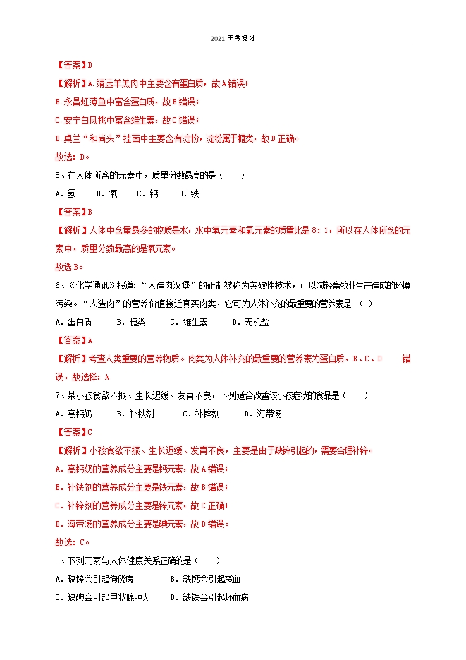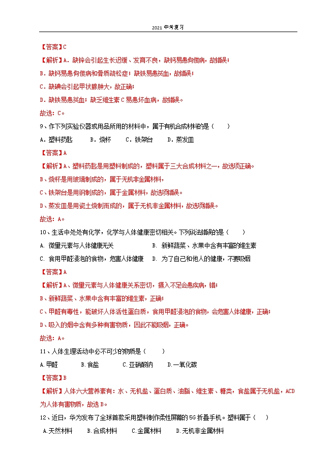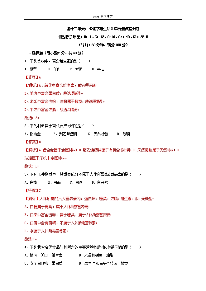 【内容简介】第十二单元:《化学与生活》单元测试提升卷相对原子质量:H:1、C:12、O:16、Ca:40、Cl:35.5(时间:60分钟,满分100分)一、选择题(每小题2分,共40分)1、下列食物中,富含维生素的是( )A.蔬菜 B.羊肉 C.米饭 D.牛油【答案】A【解析】A、蔬菜中富含维生素,故选项正确。B、羊肉中富含蛋白质,故选项错误。C、米饭中富含淀粉,淀粉属于糖类,故选项错误。D、牛油中富含油脂,故选项错误。故选:A。2、下列材料属于有机合成材料的是( )A.铝合金 B.聚乙烯塑料 C.天然橡胶 D.玻璃【答案】B【解析】A.铝合金属于金属材料;B.聚乙烯塑料属于有机合成材料;C.天然橡胶属于天然材料;D.玻璃属于无机非金属材料。故选:B。3、下列几种物质中,其重要成分不属于人体所需基本营养素的是( )A.白糖 B.白面 C.白酒 D.白开水【答案】C【解析】人体所需的六大营养素为:蛋白质,糖类,油脂,维生素,水,无机盐。A.白糖属于糖类。属于人体所需营养素;B.白面中富含淀粉,属于糖类,属于人体所需营养素;C.白酒中含有酒精,不属于人体所需营养素;D.水属于人体所需营养素。故选C。......