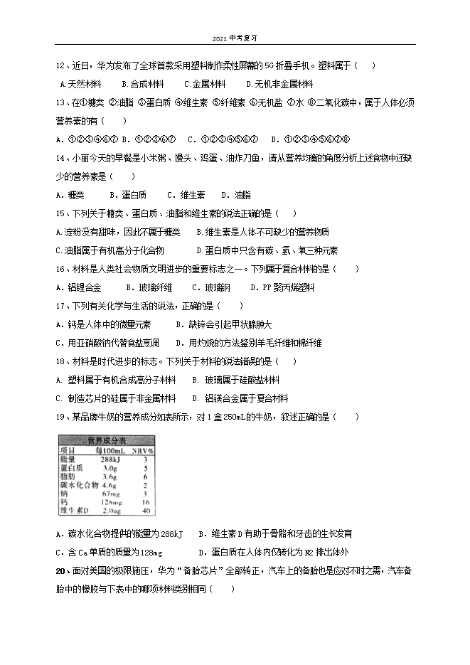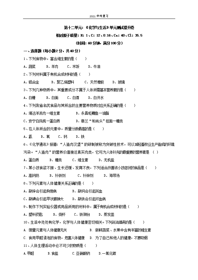 【内容简介】第十二单元:《化学与生活》单元测试提升卷相对原子质量:H:1、C:12、O:16、Ca:40、Cl:35.5(时间:60分钟,满分100分)一、选择题(每小题2分,共40分)1、下列食物中,富含维生素的是( )A.蔬菜 B.羊肉 C.米饭 D.牛油2、下列材料属于有机合成材料的是( )A.铝合金 B.聚乙烯塑料 C.天然橡胶 D.玻璃3、下列几种物质中,其重要成分不属于人体所需基本营养素的是( )A.白糖 B.白面 C.白酒 D.白开水4、下列我省名优食品与其所含的主要营养物质对应关系正确的是( )A.靖远羊羔肉--维生素 B.永昌虹鳟鱼--油脂C.安宁白凤桃--蛋白质 D.皋兰“和尚头”挂面--糖类5、在人体所含的元素中,质量分数最高的是( )A.氢 B.氧 C.钙 D.铁6、《化学通讯》报道:“人造肉汉堡”的研制被称为突破性技术,可以减轻畜牧业生产造成的环境污染。“人造肉”的营养价值接近真实肉类,它可为人体补充的最重要的营养素是 ( )A.蛋白质 B.糖类 C.维生素 D.无机盐7、某小孩食欲不振、生长迟缓、发育不良,下列适合改善该小孩症状的食品是( )A.高钙奶 B.补铁剂 C.补锌剂 D.海带汤8、下列元素与人体健康关系正确的是( )A.缺锌会引起佝偻病 B.缺钙会引起贫血C.缺碘会引起甲状腺肿大 D.缺铁会引起坏血病......