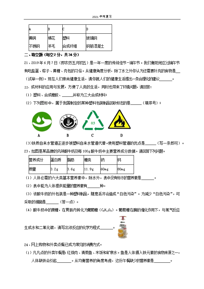 2021中考复习:人教版初中化学《第12单元 化学与生活》单元测试提升卷(原卷版)