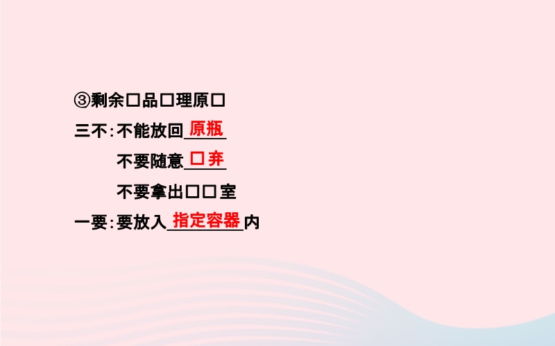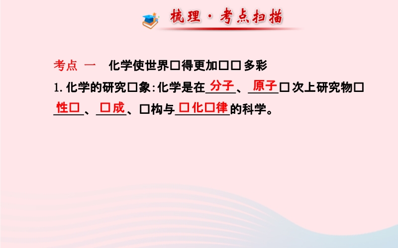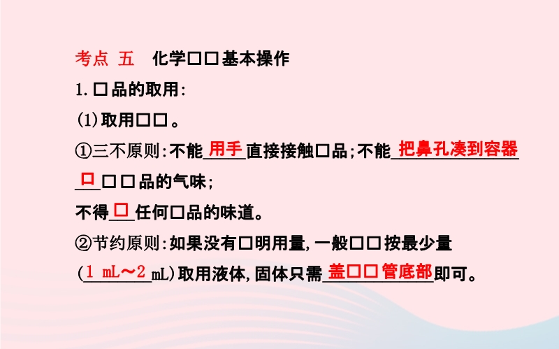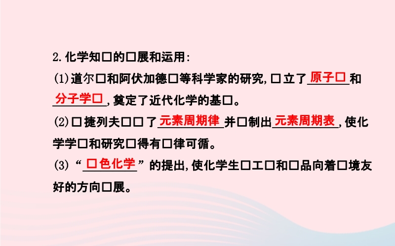 【内容简介】2.化学知识的发展和运用:(1)道尔顿和阿伏加德罗等科学家的研究,创立了_______和_________,奠定了近代化学的基础。(2)门捷列夫发现了___________并编制出___________,使化学学习和研究变得有规律可循。(3)“_________”的提出,使化学生产工艺和产品向着环境友好的方向发展。 考点 五 化学实验基本操作 1.药品的取用:(1)取用规则。①三不原则:不能_____直接接触药品;不能__________________闻药品的气味;不得___任何药品的味道。②节约原则:如果没有说明用量,一般应该按最少量(________mL)取用液体,固体只需_____________即可。......