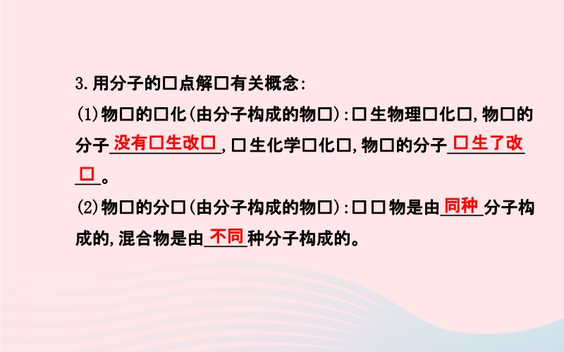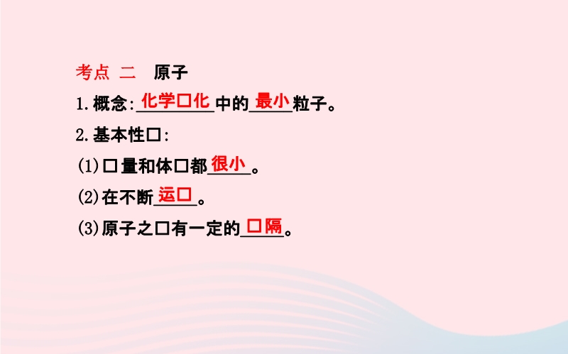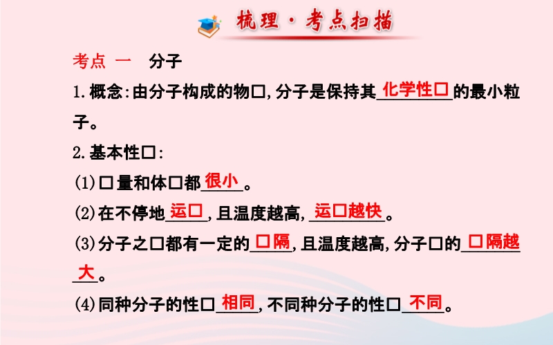 【内容简介】考点 一 分子 1.概念:由分子构成的物质,分子是保持其_________的最小粒子。2.基本性质:(1)质量和体积都_____。(2)在不停地_____,且温度越高,_________。(3)分子之间都有一定的_____,且温度越高,分子间的__________。(4)同种分子的性质_____,不同种分子的性质_____。3.用分子的观点解释有关概念:(1)物质的变化(由分子构成的物质):发生物理变化时,物质的分子_____________,发生化学变化时,物质的分子____________。(2)物质的分类(由分子构成的物质):纯净物是由_____分子构成的,混合物是由_____种分子构成的。......