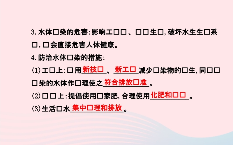 【内容简介】.水体污染的危害:影响工农业、渔业生产,破坏水生生态系统,还会直接危害人体健康。4.防治水体污染的措施:(1)工业上:应用_______、_______减少污染物的产生,同时对污染的水体作处理使之_____________。(2)农业上:提倡使用农家肥,合理使用___________。(3)生活污水_______________。考点 二 水的净化1.净化的方法:沉淀、_____、吸附、_____。2.自来水厂水的净化过程:天然水→加_______→沉淀→过滤→加活性炭_____→消毒杀菌→自来水。......