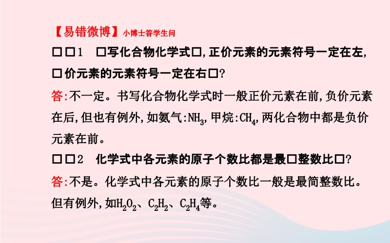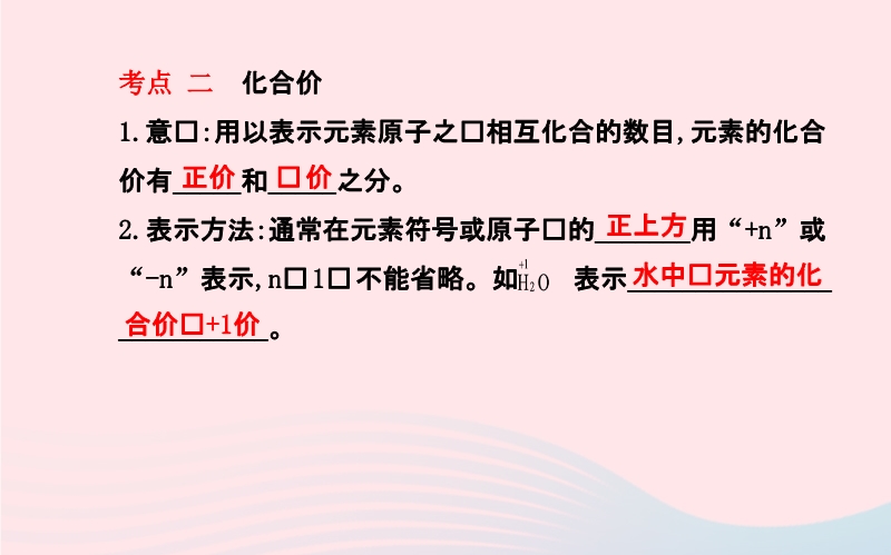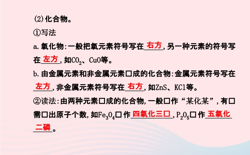 【内容简介】(2)化合物。①写法a.氧化物:一般把氧元素符号写在_____,另一种元素的符号写在_____,如CO2、CuO等。b.由金属元素和非金属元素组成的化合物:金属元素符号写在_____,非金属元素符号写在_____,如ZnS、KCl等。②读法:由两种元素组成的化合物,一般读作“某化某”,有时需读出原子个数,如Fe3O4读作___________,P2O5读作____________。考点 二 化合价 1.意义:用以表示元素原子之间相互化合的数目,元素的化合价有_____和_____之分。2.表示方法:通常在元素符号或原子团的_______用“+n”或“-n”表示,n为1时不能省略。如 表示__________________________。......