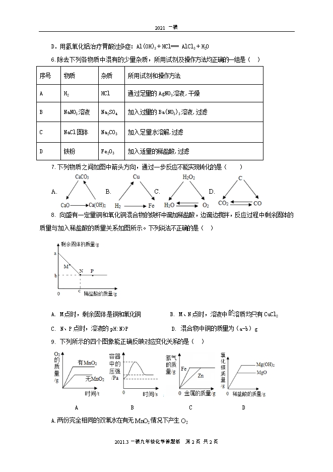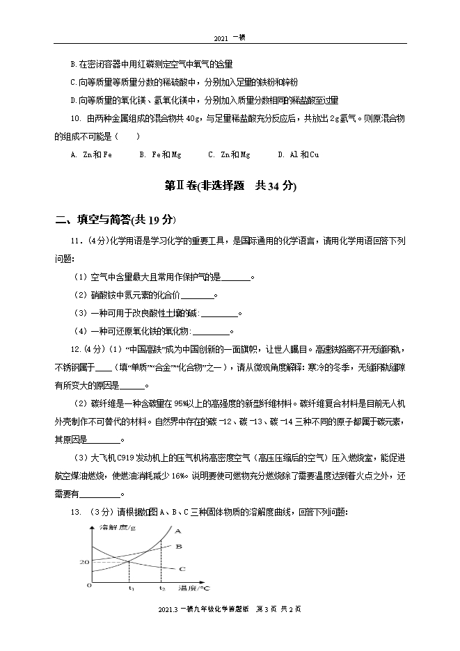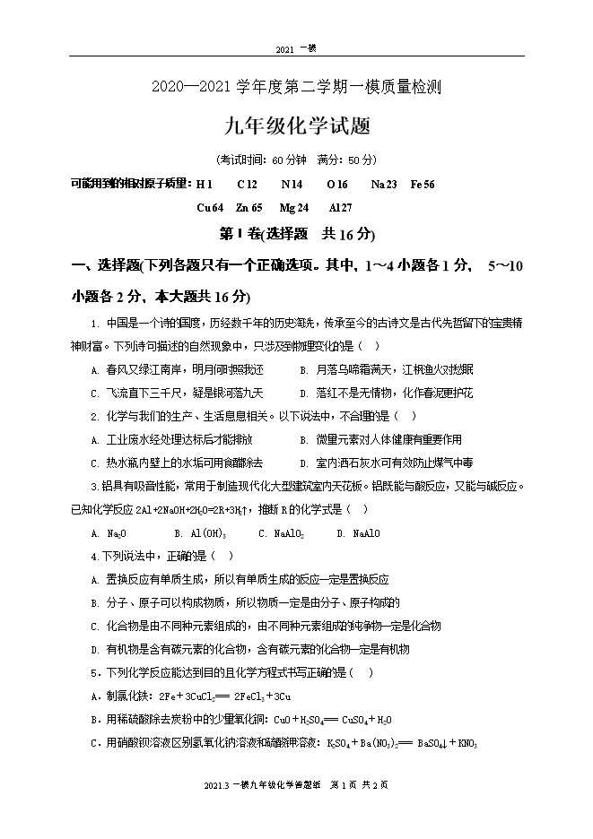 【内容简介】可能用到的相对原子质量:H 1 C 12 N 14 O 16 Na 23 Fe 56 Cu 64 Zn 65 Mg 24 Al 27第Ⅰ卷(选择题 共16分)一、选择题(下列各题只有一个正确选项。其中,1~4小题各1分, 5~10小题各2分,本大题共16分)1. 中国是一个诗的国度,历经数千年的历史淘洗,传承至今的古诗文是古代先哲留下的宝贵精神财富。下列诗句描述的自然现象中,只涉及到物理变化的是( )A. 春风又绿江南岸,明月何时照我还 B. 月落乌啼霜满天,江枫渔火对愁眠C. 飞流直下三千尺,疑是银河落九天 D. 落红不是无情物,化作春泥更护花2. 化学与我们的生产、生活息息相关。以下说法中,不合理的是( )A. 工业废水经处理达标后才能排放 B. 微量元素对人体健康有重要作用C. 热水瓶内壁上的水垢可用食醋除去 D. 室内洒石灰水可有效防止煤气中毒3.铝具有吸音性能,常用于制造现代化大型建筑室内天花板。铝既能与酸反应,又能与碱反应。已知化学反应2Al+2NaOH+2H2O=2R+3H2↑,推断R的化学式是( )A. Na2O B. Al(OH)3 C. NaAlO2 D. NaAlO4.下列说法中,正确的是( )A. 置换反应有单质生成,所以有单质生成的反应一定是置换反应B. 分子、原子可以构成物质,所以物质一定是由分子、原子构成的C. 化合物是由不同种元素组成的,由不同种元素组成的纯净物一定是化合物D. 有机物是含有碳元素的化合物,含有碳元素的化合物一定是有机物5.下列化学反应能达到目的且化学方程式书写正确的是( )A.制氯化铁:2Fe+3CuCl2=== 2FeCl3+3CuB.用稀硫酸除去炭粉中的少量氧化铜:CuO+H2SO4=== CuSO4+H2OC.用硝酸钡溶液区别氢氧化钠溶液和硫酸钾溶液:K2SO4+Ba(NO3)2=== BaSO4↓+KNO3D.用氢氧化铝治疗胃酸过多症:Al(OH)3+HCl=== AlCl3+H2O6.除去下列各物质中混有的少量杂质,所用试剂及操作方法均正确的一组是( )......