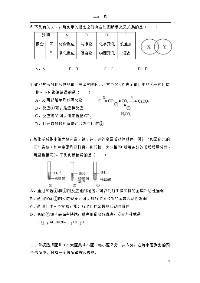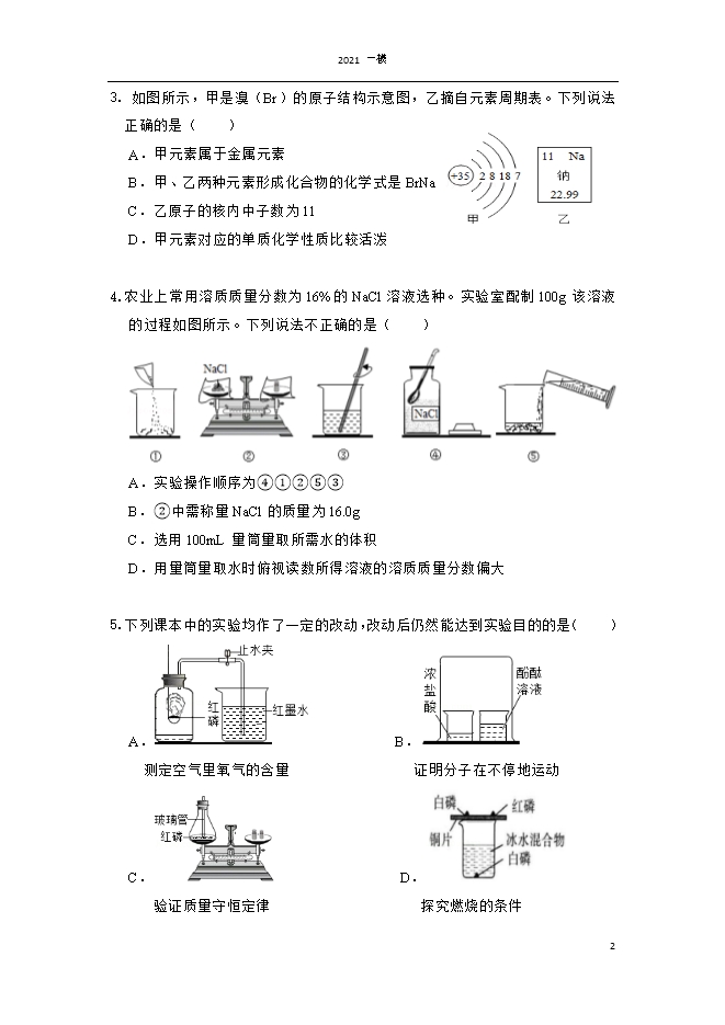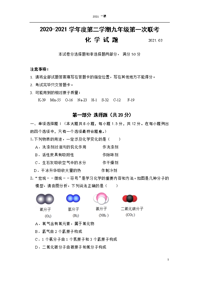 【内容简介】2020-2021学年度第二学期九年级第一次联考 化 学 试 题 2021.03本试卷分选择题和非选择题两部分,满分50分注意事项:1.请将全部试题答案填写在答题卡的指定位置,写在其他地方不能得分。2.考试完毕只交答题卡。3.可能用到的相对原子质量:K-39 Mn-55 O-16 Na-23 H-1 S-32 C-12 F-19第一部分 选择题(共20分)一、单项选择题Ⅰ(本大题共8小题,每小题1.5分,共12分。在每小题列出的四个选项中,只有一个选项最符合题意。)1.下列物质的用途,一定涉及化学变化的是( )A.洗涤剂对油污的乳化作用 作洗涤剂B.活性炭具有吸附性 作除味剂C.生石灰吸收空气中的水分 作干燥剂D.干冰升华吸收大量的热 作制冷剂2.“宏观﹣﹣微观﹣﹣符号”是学习化学的重要内容和方法。如图是几种分子的模型,请由图分析,下列说法正确的是( ) A.氧气含有氧元素,属于氧化物B.氢气由2个氢原子构成C.1个氨分子由1个氮原子和3个氢原子构成D.二氧化碳分子由碳原子和氧分子构成3. 如图所示,甲是溴(Br)的原子结构示意图,乙摘自元素周期表。下列说法正确的是( )A.甲元素属于金属元素B.甲、乙两种元素形成化合物的化学式是BrNaC.乙原子的核内中子数为11D.甲元素对应的单质化学性质比较活泼4.农业上常用溶质质量分数为16%的NaCl溶液选种。实验室配制100g该溶液的过程如图所示。下列说法不正确的是( )......