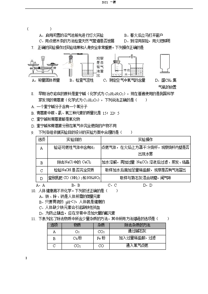 【内容简介】2021 年佛山市中考化学一模模拟试卷可能用到的相对原子质量:H-1C-12S-32O-16Zn-65一、选择题(本大题包括 15 小题,每小题 3 分,共 45 分。在每小题列出的四个选项中,只有一个是正确的,请将答题卡上对应题目所选的选项涂黑)1.下列过程属于物理变化的是()A.鲜牛奶变质B.发酵粉发面C. 石油蒸馏得到汽油D.铁矿石炼铁2.盛烧碱的试剂瓶上应该贴有下列哪种标志()3.下列物品所使用的主要材料,属于有机合成材料的是 ()A.B.C.D. 4.生活中常见的一些食物的近似 pH 如下:食物葡萄汁苹果汁牛奶鸡蛋清pH3.5-4.52.9-3.36.3-6.67.6-8.0下列说法中不正确的是()A.苹果汁和葡萄汁均显酸性B. 鸡蛋清和牛奶均显碱性C. 苹果汁比葡萄汁的酸性强D. 胃酸过多的人应少饮苹果汁和葡萄汁5.从《中国成语大会》到《中国诗词大会》,中国诗词文化大放异彩,很多成语、诗词中蕴含着丰富的科学道理,下列说法错误的是()A.“火要虚”是说氧气浓度越高,可燃物燃烧越旺B.“一畦春韭绿,十里稻花香”是因为分子在不断地运动C.“真金不怕火炼”说明黄金的化学性质非常稳定D.“沙里淘金”与“百炼成钢”蕴含的化学原理不同6.在工作和生活中,为了防止发生事故,常采取一些安全措施。下列措施比较安全的是......