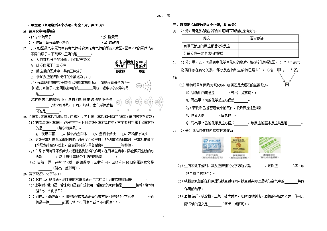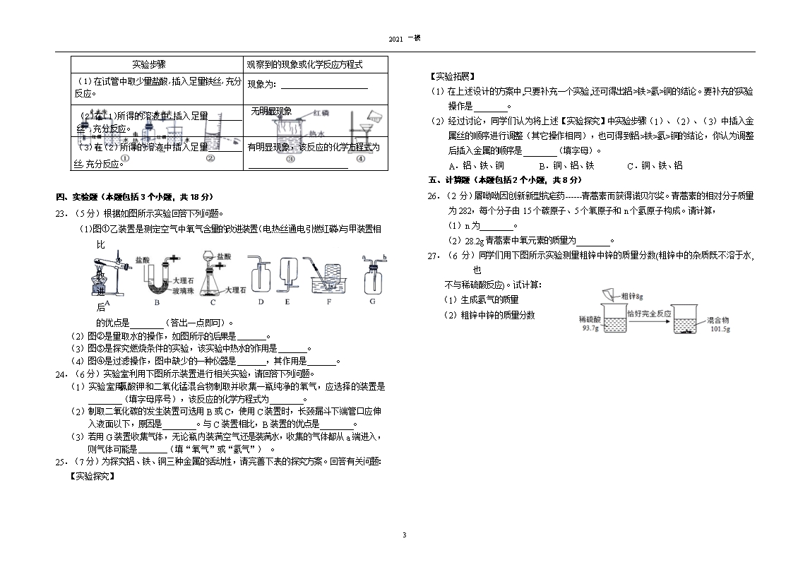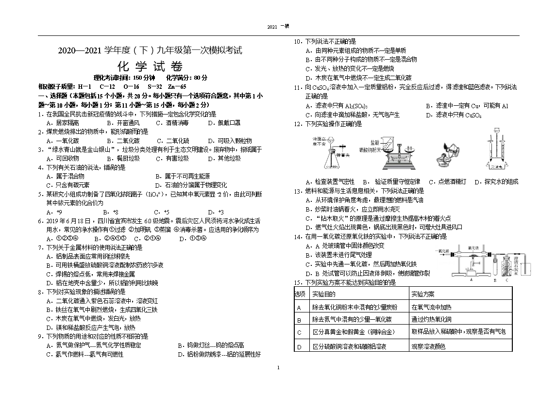 【内容简介】2020—2021学年度(下)九年级第一次模拟考试化 学 试 卷理化考试时间:150分钟 化学满分:80分相对原子质量:H—1 C—12 O—16 S—32 Zn—65一、选择题(本题包括15个小题,共20分。每小题只有一个选项符合题意,其中第1小题~第10小题,每小题1分;第11小题~第15小题,每小题2分)1.在我国全民抗击新冠疫情的战斗中,下列措施一定包含化学变化的是A.居家隔离 B.开窗通风 C.酒精消毒 D.佩戴口罩2.煤炭燃烧排出的物质中,能形成酸雨的是A.一氧化碳 B.二氧化碳 C.二氧化硫 D.可吸入颗粒物3.“绿水青山就是金山银山”,垃圾分类处理有利于生态文明建设。废弃物中,报纸属于A.可回收物 B.餐厨垃圾 C.有害垃圾 D.其他垃圾4.下列有关石油的说法,错误的是A.属于混合物 B.属于不可再生能源 C.只含有碳元素 D.石油的分馏属于物理变化5.某研究小组成功制备了四氧化铱阳离子(IiO4+),已知其中氧元素显﹣2价,由此可判断其中铱元素的化合价为A.+9 B.+8 C.+5 D.+36.2019年6月18日 ,四川省宜宾市发生6.0级地震。震后灾区人民须将河水净化成生活用水,常见的净水操作有①过滤 ②加明矾 ③蒸馏 ④消毒杀菌。应选用的净化顺序为A.①②③④ B.②④①③ C.②①④ D.①③④7.下列关于金属材料的使用说法正确的是A.铝制品表面应常用钢丝球擦洗B.可用铁桶盛放硫酸铜溶液配制农药波尔多液C.焊锡的熔点低,常用来焊接金属D.铝在地壳中含量少,所以铝的利用比铁晚8.下列对实验现象的描述错误的是A.二氧化碳通入紫色石蕊溶液中,溶液变红B.铁丝在氧气中剧烈燃烧,生成四氧化三铁C.木炭在氧气中燃烧,发白光,放热D.镁和稀盐酸反应产生气泡,放热9.下列物质的用途和对应的性质不相符的是 A.氮气做保护气---氮气化学性质稳定 B.钨做灯丝---钨的熔点高C.氢气作燃料---氢气有可燃性 D.铝粉做防锈漆---铝的延展性好......