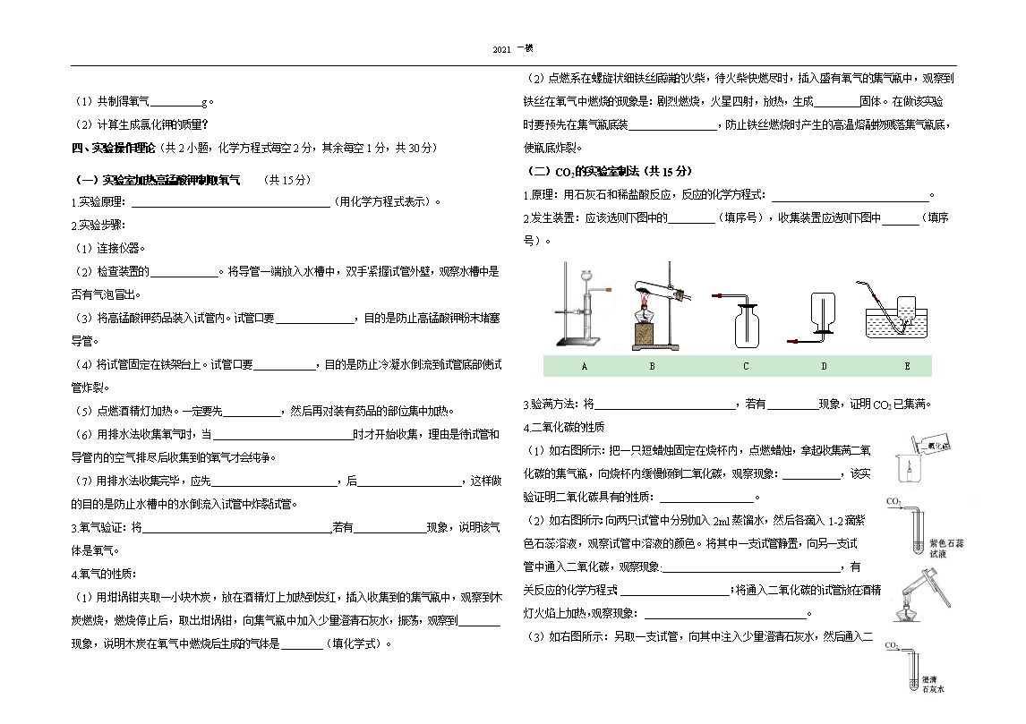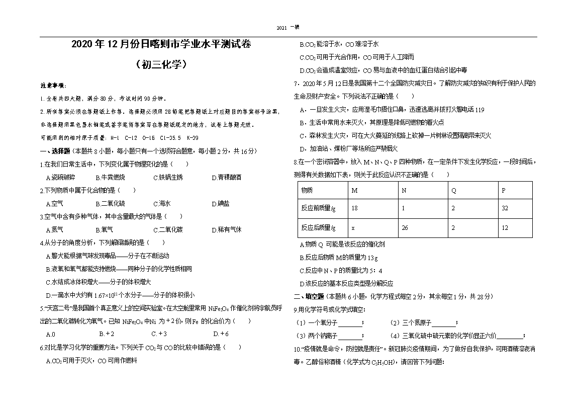 西藏日喀则市2020-2021学年九年级上学期学业水平考试(一模)化学试题(Word版含答案)