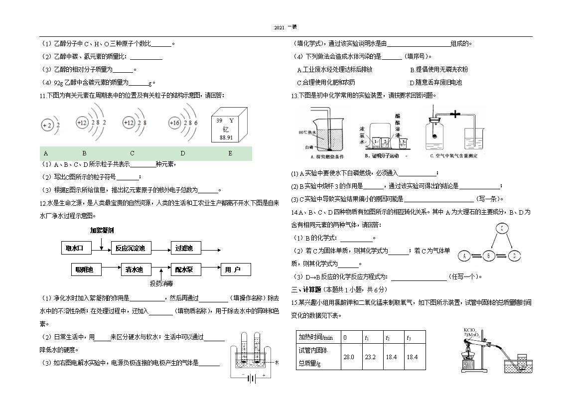 【内容简介】一、选择题(本题共8小题,每小题只有一个选项符合题意,每小题2分,共16分)1.在我们日常生活中,下列变化属于物理变化的是( )A.瓷碗破碎 B.牛粪燃烧 C.铁锅生锈 D.青稞酿酒2.下列物质中属于化合物的是( )A.空气 B.二氧化硫 C.海水 D.碘盐3.空气中含有多种气体,其中含量最大的气体是( )A.氮气 B.氧气 C.二氧化碳 D.稀有气休4.从分子的角度分析,下列解释错误的是( )A.警犬能根据气味发现毒品——分子在不断运动B.液氧和氧气都能支持燃烧——同种分子的化学性质相同C.水结成冰体积增大——分子的体积增大D.一滴水中大约有1.67×1021个水分子——分子的体积很小5.“天宫二号”是我国首个真正意义上的空间实验室。在太空舱里常用 NiFe2O4 作催化剂将宇航员呼出的二氧化碳转化为氧气。已知 NiFe2O4 中 Ni 为﹢2 价,则 Fe 的化合价为( )A.0 B.﹢2 C.﹢3 D.﹢66.对比是学习化学的重要方法。下列关于CO2与CO的比较中错误的是( )A.CO2可用于灭火,CO可用作燃料B.CO2能溶于水,CO难溶于水......