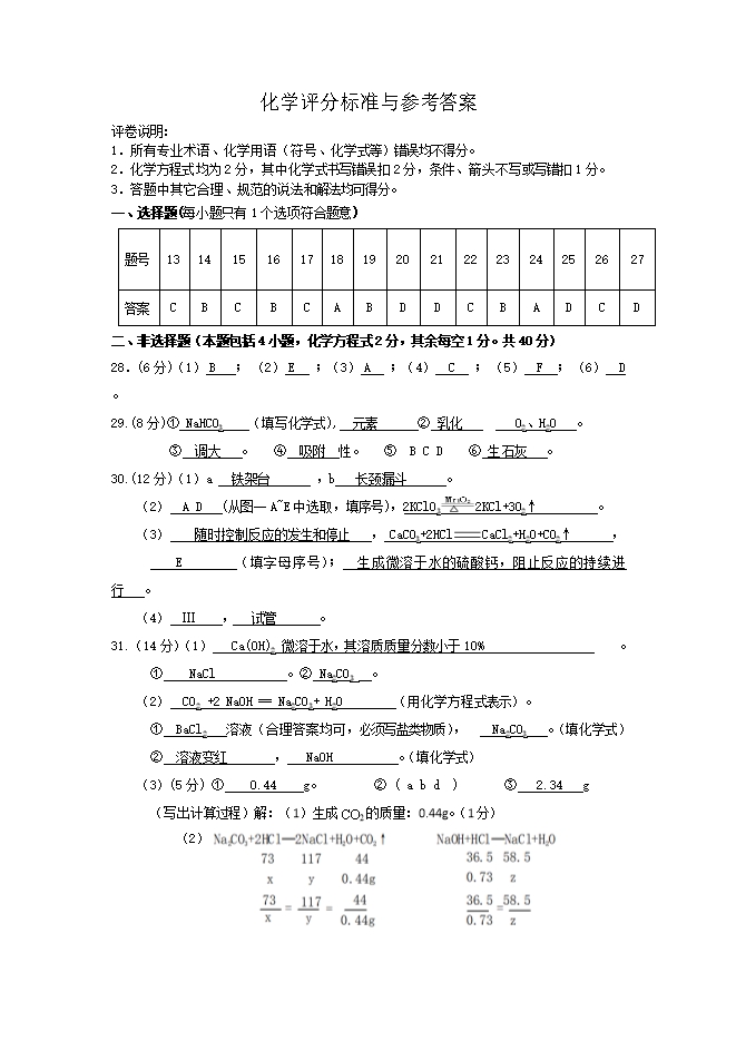 【内容简介】一、选择题(本题包括15小题,每小题2分,共30分。每小题只有一个选项符合题意)13.6月5日是世界环境日,保护环境人人有责。下列行为能减少环境污染的是( )A. 废旧电池掩埋处理 B. 露天焚烧秸秆C. 生活污水集中处理 D. 燃放烟花爆竹14.实验室里发生的下列变化,属于化学变化的是( )A.锥形瓶破裂 B.铁架台生锈 C.酒精挥发 D.浓硫酸吸水15.某同学书写的试剂标签如图,其中错误的是( )A. B. C. D. 16.下列实验操作中不正确的是( ) A.加热液体 B.稀释浓硫酸 C.蒸发食盐水 D.检查装置气密性17.下列实验现象描述正确的是( )A. 硬水中滴加肥皂水,产生大量泡沫 B. 镁条在空气中燃烧,生成白色氧化镁C. 硫在空气中燃烧,产生淡蓝色火焰 D. 打开浓盐酸瓶盖,瓶口产生大量白烟18.“5G”改变生活,中国芯彰显中国“智”造。高纯度单质硅(Si)是制作芯片的材料。 如图是硅元素在元素周期表中的相关信息,下列说法正确的是( )A. 硅原子的质子数为14 B. 硅元素的相对原子质量为28.09gC. 硅元素属于非金属元素 D. 硅元素是地壳中含量最高的元素19.下列有关粗盐提纯实验说法错误的是( )A. 溶解粗盐时,应加入适量的水,以提高实验效率B. 过滤时,为加快过滤速度,可用玻璃棒在漏斗内搅拌C. 蒸发滤液时,待蒸发皿中出现较多固体时,停止加热D. 蒸发结束后,用玻璃棒将固体转移到指定的容器中......