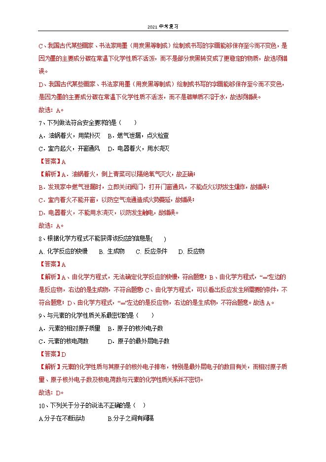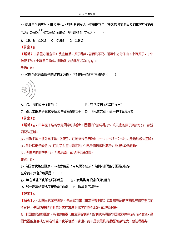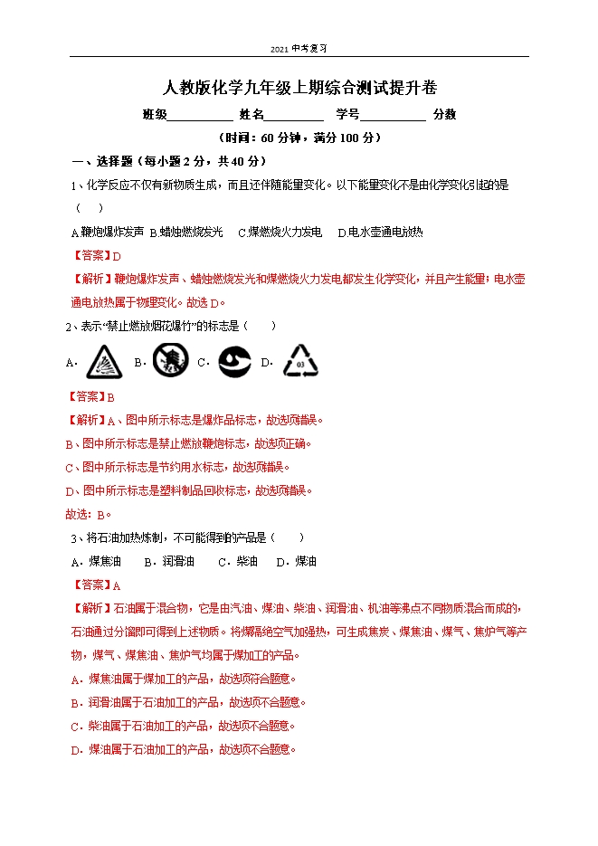 【内容简介】一、选择题(每小题2分,共40分)1、化学反应不仅有新物质生成,而且还伴随能量变化。以下能量变化不是由化学变化引起的是( )A.鞭炮爆炸发声 B.蜡烛燃烧发光 C.煤燃烧火力发电 D.电水壶通电放热【答案】D【解析】鞭炮爆炸发声、蜡烛燃烧发光和煤燃烧火力发电都发生化学变化,并且产生能量;电水壶通电放热属于物理变化。故选D。2、表示“禁止燃放烟花爆竹”的标志是( )A. B. C. D. 【答案】B【解析】A、图中所示标志是爆炸品标志,故选项错误。B、图中所示标志是禁止燃放鞭炮标志,故选项正确。C、图中所示标志是节约用水标志,故选项错误。D、图中所示标志是塑料制品回收标志,故选项错误。故选:B。3、将石油加热炼制,不可能得到的产品是( )A.煤焦油 B.润滑油 C.柴油 D.煤油【答案】A【解析】石油属于混合物,它是由汽油、煤油、柴油、润滑油、机油等沸点不同物质混合而成的,石油通过分馏即可得到上述物质。将煤隔绝空气加强热,可生成焦炭、煤焦油、煤气、焦炉气等产物,煤气、煤焦油、焦炉气均属于煤加工的产品。A.煤焦油属于煤加工的产品,故选项符合题意。B.润滑油属于石油加工的产品,故选项不合题意。C.柴油属于石油加工的产品,故选项不合题意。D.煤油属于石油加工的产品,故选项不合题意。4、煤油中含有噻吩(用X表示),噻吩具有令人不愉快的气味,其燃烧时发生反应的化学方程式表示为:X+6O2(〖点燃〗┬¯)/4CO2+SO2+2H2O,则噻吩的化学式为( )A.CH4B.C4H4SC.C4H6SD.C4H8S【答案】B【解析】由质量守恒定律:反应前后,原子种类、数目均不变,则每个X分子由4个碳原子、1个硫原子和4个氢原子构成,则物质X的化学式为C4H4S。故选:B。5、如图为某元素原子的结构示意图。下列有关叙述不正确的是( )......
