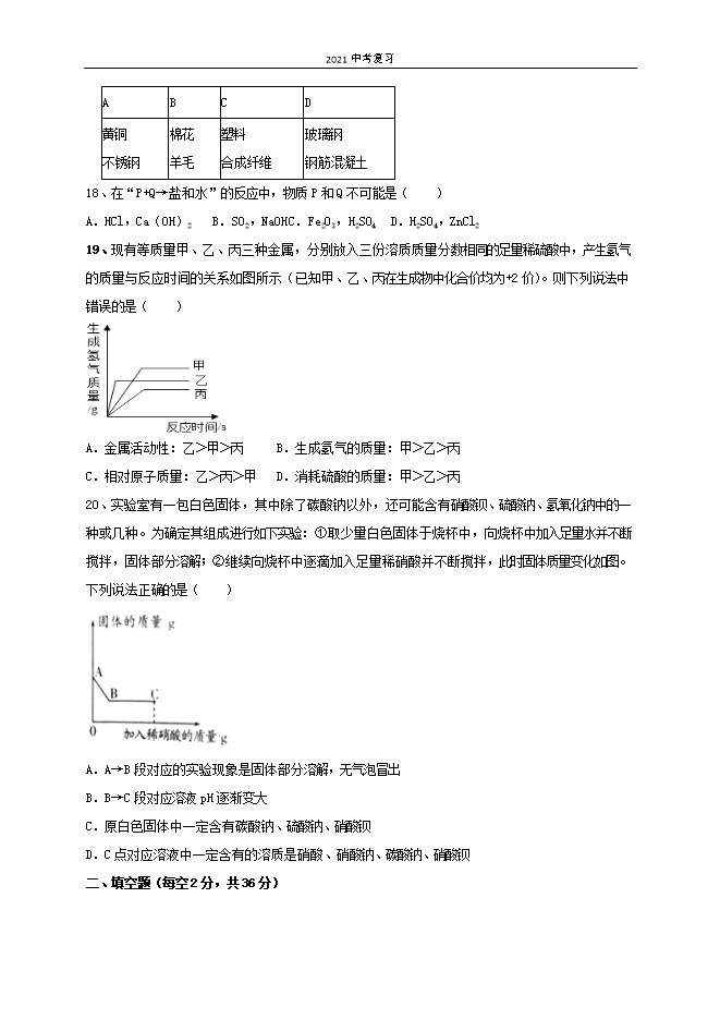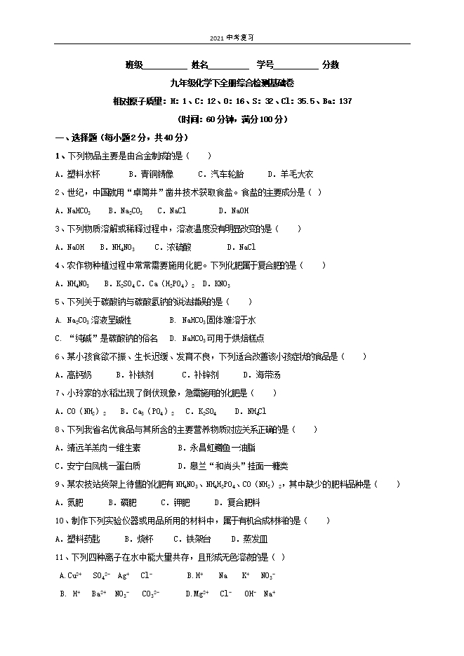 【内容简介】一、选择题(每小题2分,共40分)1、下列物品主要是由合金制成的是( )A.塑料水杯 B.青铜铸像 C.汽车轮胎 D.羊毛大衣 2、世纪,中国就用“卓筒井”凿井技术获取食盐。食盐的主要成分是()A.NaHCO3 B.Na2CO3 C.NaCl D.NaOH3、下列物质溶解或稀释过程中,溶液温度没有明显改变的是( )A.NaOH B.NH4NO3 C.浓硫酸 D.NaCl 4、农作物种植过程中常常需要施用化肥。下列化肥属于复合肥的是( )A.NH4NO3B.K2SO4C.Ca(H2PO4)2D.KNO35、下列关于碳酸钠与碳酸氢钠的说法错误的是( )A. Na2CO3溶液呈碱性 B. NaHCO3固体难溶于水C. “纯碱”是碳酸钠的俗名D. NaHCO3可用于烘焙糕点6、某小孩食欲不振、生长迟缓、发育不良,下列适合改善该小孩症状的食品是( )A.高钙奶 B.补铁剂 C.补锌剂 D.海带汤7、小玲家的水稻出现了倒伏现象,急需施用的化肥是( )A.CO(NH2)2B.Ca3(PO4)2C.K2SO4 D.NH4Cl8、下列我省名优食品与其所含的主要营养物质对应关系正确的是( )A.靖远羊羔肉--维生素 B.永昌虹鳟鱼--油脂C.安宁白凤桃--蛋白质 D.皋兰“和尚头”挂面--糖类......