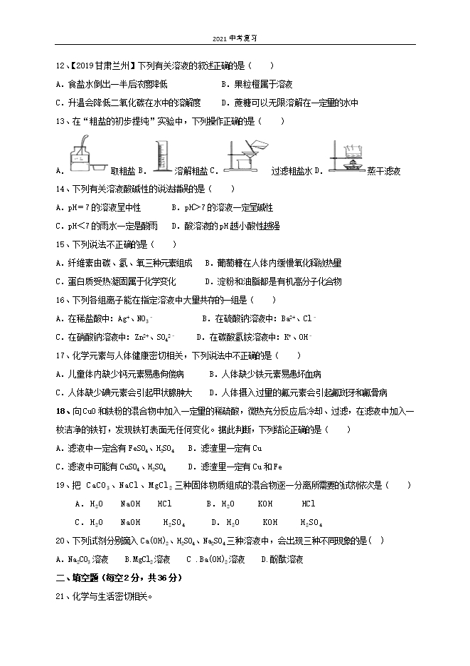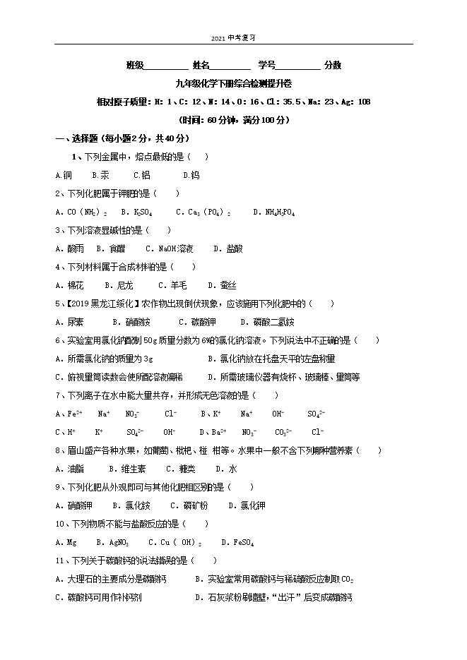 【内容简介】一、选择题(每小题2分,共40分)1、下列金属中,熔点最低的是( )A.铜 B.汞 C.铝 D.钨2、下列化肥属于钾肥的是( )A.CO(NH2)2B.K2SO4 C.Ca3(PO4)2 D.NH4H2PO43、下列溶液显碱性的是( )A.酸雨 B.食醋 C.NaOH溶液 D.盐酸4、下列材料属于合成材料的是( )A.棉花 B.尼龙 C.羊毛 D.蚕丝5、【2019黑龙江绥化】农作物出现倒伏现象,应该施用下列化肥中的( )A.尿素 B.硝酸铵 C.碳酸钾 D.磷酸二氢铵6、实验室用氯化钠配制50g质量分数为6%的氯化钠溶液。下列说法中不正确的是( )A.所需氯化钠的质量为3g B.氯化钠放在托盘天平的左盘称量C.俯视量筒读数会使所配溶液偏稀 D.所需玻璃仪器有烧杯、玻璃棒、量筒等7、下列离子在水中能大量共存,并形成无色溶液的是( )A、Fe2+ Na+ NO3- Cl- B、K+ Na+ OH- SO42- C、H+ K+ SO42- OH- D、Ba2+ NO3- CO32- Cl- 8、眉山盛产各种水果,如葡萄、枇杷、椪 柑等。水果中一般不含下列哪种营养素( )A.油脂 B.维生素 C.糖类 D.水9、下列化肥从外观即可与其他化肥相区别的是( )A.硝酸钾 B.氯化铵 C.磷矿粉 D.氯化钾10、下列物质不能与盐酸反应的是( )......