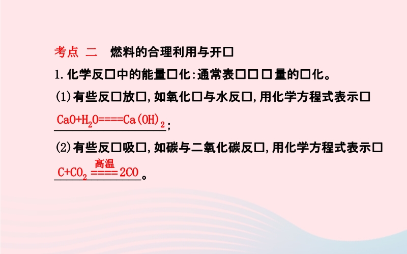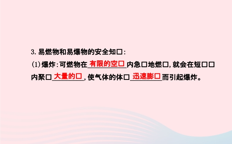 【内容简介】易燃物和易爆物的安全知识:(1)爆炸:可燃物在___________内急剧地燃烧,就会在短时间内聚积_________,使气体的体积_________而引起爆炸。燃料的合理利用与开发 1.化学反应中的能量变化:通常表现为热量的变化。(1)有些反应放热,如氧化钙与水反应,用化学方程式表示为__________________;(2)有些反应吸热,如碳与二氧化碳反应,用化学方程式表示为______________。“可燃性气体与氧气或空气混合后一定会引起爆炸”,这种认识是否正确,为什么?答:不正确。可燃性气体与空气混合后不一定引起爆炸,只有空气或氧气的含量达到一定的范围(即爆炸极限)时,才有可能发生爆炸。.....