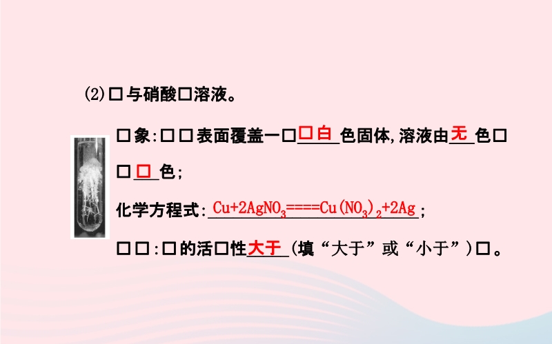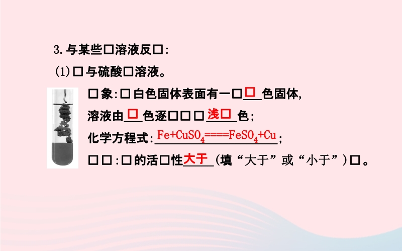 【内容简介】与某些盐溶液反应:(1)铁与硫酸铜溶液。现象:银白色固体表面有一层___色固体,溶液由___色逐渐变为_____色;化学方程式:____________________;结论:铁的活动性_____(填“大于”或“小于”)铜。铜与硝酸银溶液现象:铜丝表面覆盖一层_____色固体,溶液由___色变为___色;化学方程式:_________________________;结论:铜的活动性_____(填“大于”或“小于”)银。1.金属活动性顺序:2.重要应用:(1)判断金属的活动性强弱:金属的位置越靠前,它的活动性_____。(2)判断金属与酸是否发生反应:排在___前面的金属能置换出盐酸、稀硫酸里的___。(3)判断金属与盐溶液是否发生反应:位于___________能把位于___________从它们的盐溶液里置换出来。......