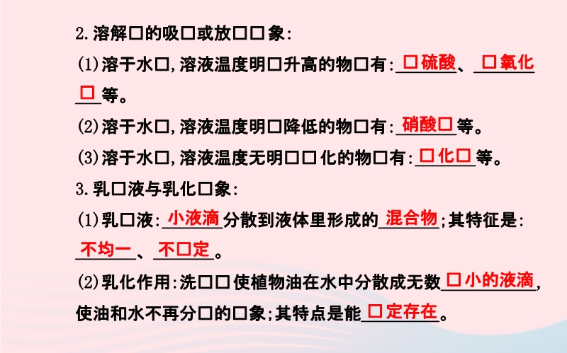 【内容简介】考点 一 溶液的形成 1.溶液:(1)概念:_______________分散到___________里形成的_____的、_____的混合物。(2)组成。①溶质:_______的物质,可以是_____、_____或_____。②溶剂:能_____________的物质,___是最常用的溶剂。(3)特征:_____性、_____性。2.溶解时的吸热或放热现象:(1)溶于水时,溶液温度明显升高的物质有:_______、__________等。(2)溶于水时,溶液温度明显降低的物质有:_______等。(3)溶于水时,溶液温度无明显变化的物质有:_______等。3.乳浊液与乳化现象:(1)乳浊液:_______分散到液体里形成的_______;其特征是:_______、_______。(2)乳化作用:洗涤剂使植物油在水中分散成无数___________,使油和水不再分层的现象;其特点是能_________。......