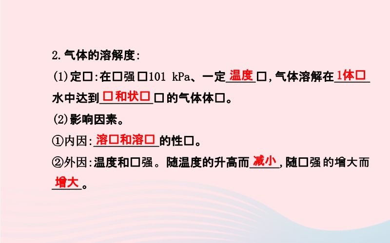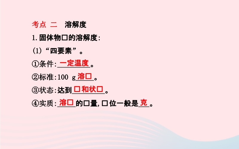 【内容简介】考点 二 溶解度 1.固体物质的溶解度:(1)“四要素”。①条件:_________。②标准:100 g_____。③状态:达到_________。④实质:_____的质量,单位一般是___。2.气体的溶解度:(1)定义:在压强为101 kPa、一定_____时,气体溶解在______水中达到_________时的气体体积。(2)影响因素。①内因:___________的性质。②外因:温度和压强。随温度的升高而_____,随压强的增大而_____。“稀溶液一定是不饱和溶液,浓溶液一定是饱和溶液”,这种观点正确吗?为什么?答:不正确。稀溶液不一定是不饱和溶液,如饱和石灰水;浓溶液不一定是饱和溶液,如90%的浓硫酸。......