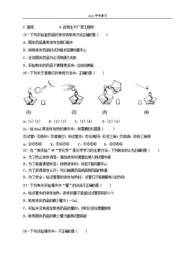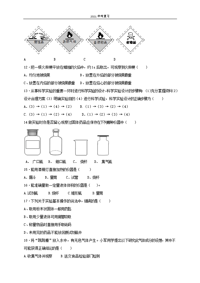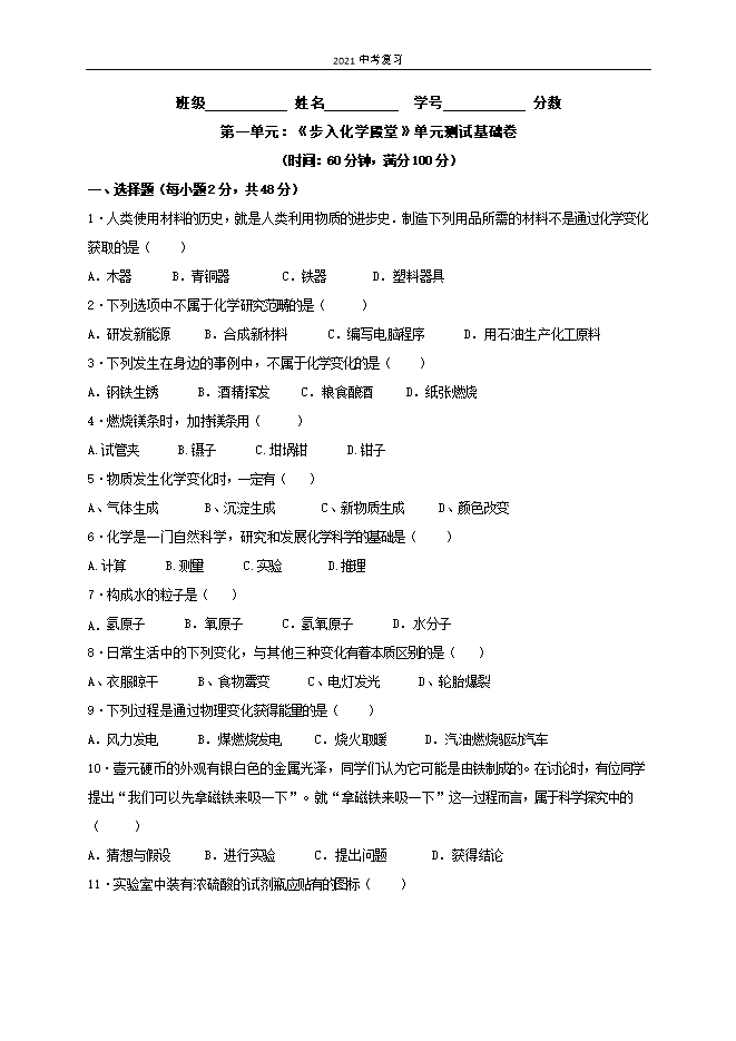 2021中考复习:鲁教版初中化学《第1单元 步入化学殿堂》单元测试基础卷(原卷版)
