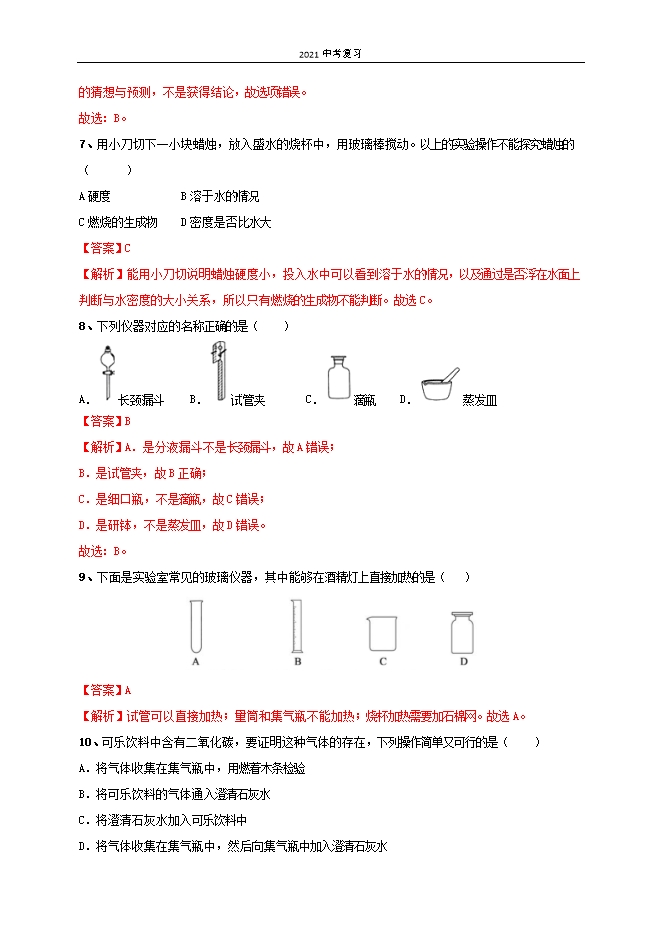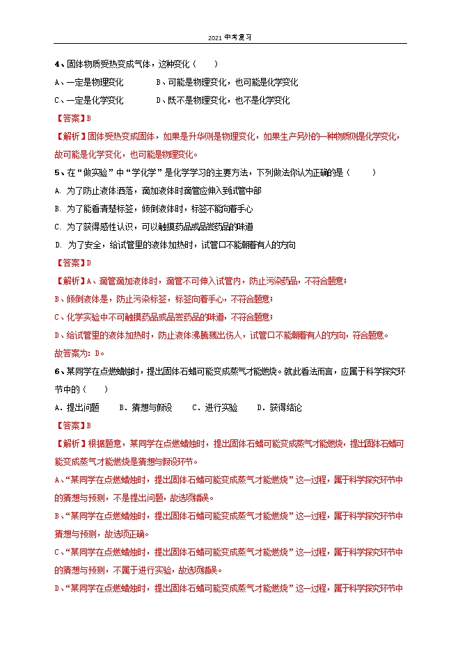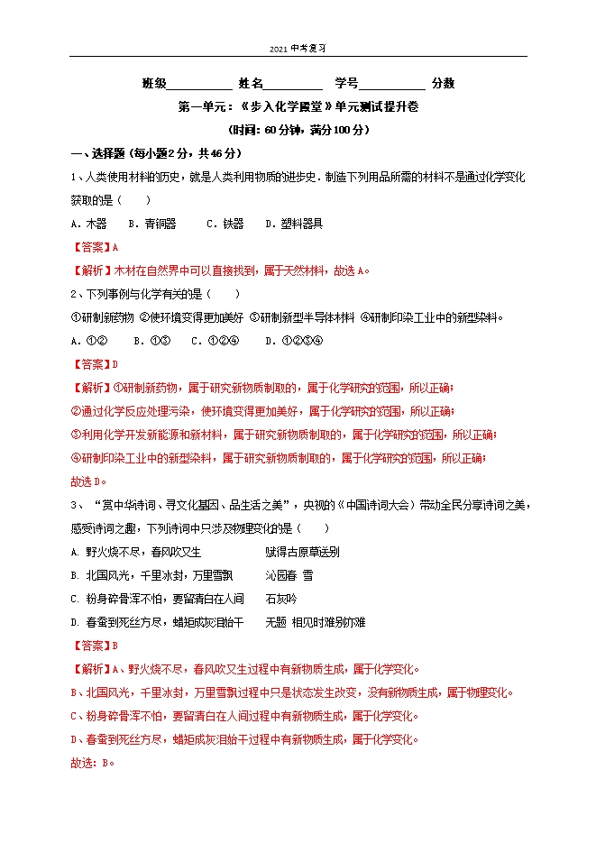 【内容简介】一、选择题(每小题2分,共46分)1、人类使用材料的历史,就是人类利用物质的进步史.制造下列用品所需的材料不是通过化学变化获取的是( )A.木器 B.青铜器 C.铁器 D.塑料器具【答案】A【解析】木材在自然界中可以直接找到,属于天然材料,故选A。2、下列事例与化学有关的是( )①研制新药物 ②使环境变得更加美好 ③研制新型半导体材料 ④研制印染工业中的新型染料。A.①② B.①③ C.①②④ D.①②③④【答案】D【解析】①研制新药物,属于研究新物质制取的,属于化学研究的范围,所以正确;②通过化学反应处理污染,使环境变得更加美好,属于化学研究的范围,所以正确;③利用化学开发新能源和新材料,属于研究新物质制取的,属于化学研究的范围,所以正确;④研制印染工业中的新型染料,属于研究新物质制取的,属于化学研究的范围,所以正确;故选D。3、 “赏中华诗词、寻文化基因、品生活之美”,央视的《中国诗词大会)带动全民分享诗词之美,感受诗词之趣,下列诗词中只涉及物理变化的是( )A. 野火烧不尽,春风吹又生 赋得古原草送别 B. 北国风光,千里冰封,万里雪飘 沁园春 雪 C. 粉身碎骨浑不怕,要留清白在人间 石灰吟 D. 春蚕到死丝方尽,蜡矩成灰泪始干 无题 相见时难别亦难【答案】B【解析】A、野火烧不尽,春风吹又生过程中有新物质生成,属于化学变化。 B、北国风光,千里冰封,万里雪飘过程中只是状态发生改变,没有新物质生成,属于物理变化。 C、粉身碎骨浑不怕,要留清白在人间过程中有新物质生成,属于化学变化。 D、春蚕到死丝方尽,蜡矩成灰泪始干过程中有新物质生成,属于化学变化。 ......