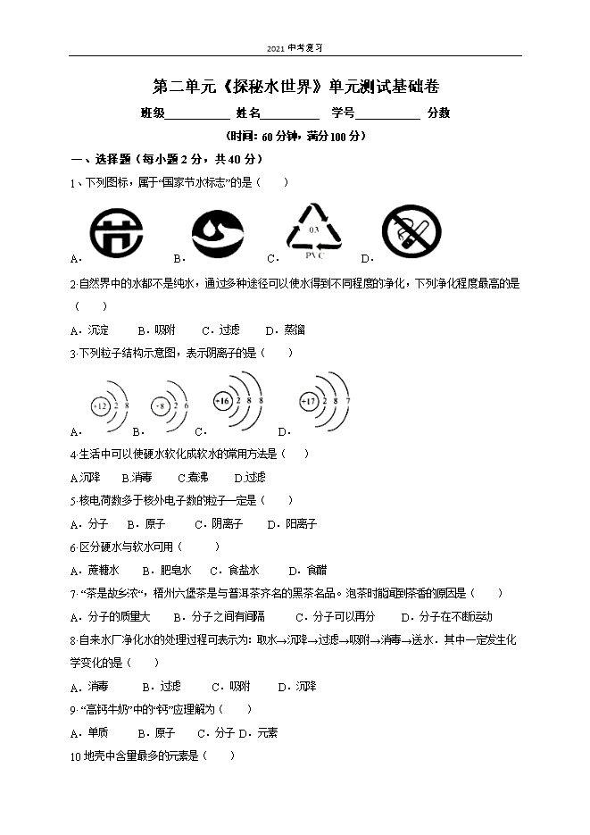 2021中考复习:鲁教版初中化学《第2单元 探秘水世界》单元测试基础卷(原卷版)