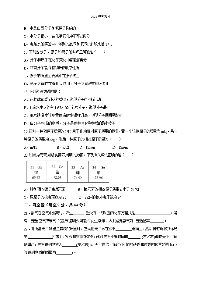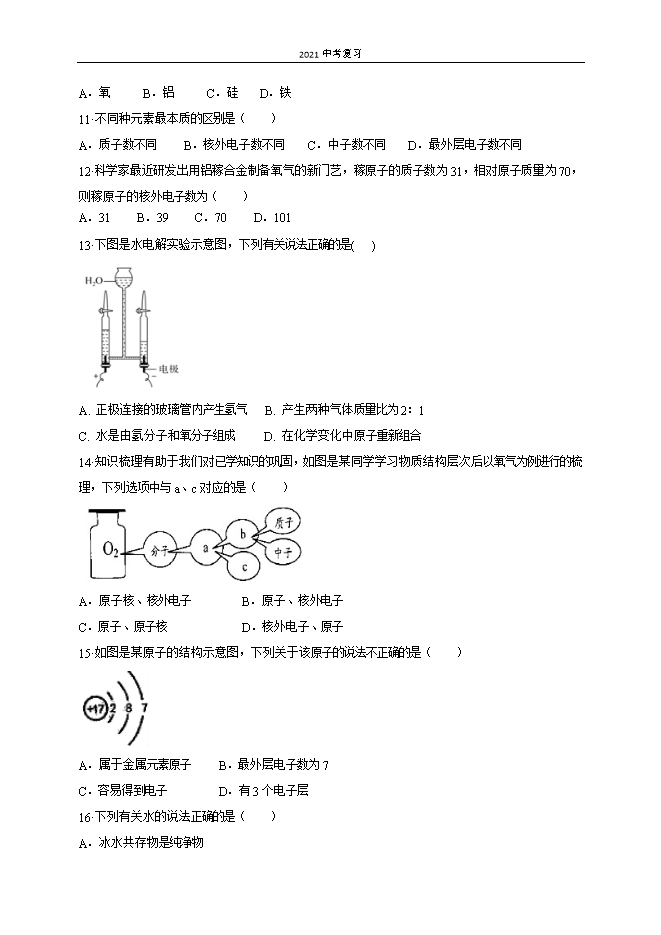 【内容简介】一、选择题(每小题2分,共40分)1、下列图标,属于“国家节水标志”的是( )A. B. C. D. 2•自然界中的水都不是纯水,通过多种途径可以使水得到不同程度的净化,下列净化程度最高的是( )A.沉淀 B.吸附 C.过滤 D.蒸馏3•下列粒子结构示意图,表示阴离子的是( )A. B. C. D. 4•生活中可以使硬水软化成软水的常用方法是( )A.沉降 B.消毒 C.煮沸 D.过滤5•核电荷数多于核外电子数的粒子一定是( )A.分子 B.原子 C.阴离子 D.阳离子6•区分硬水与软水可用( )A.蔗糖水 B.肥皂水 C.食盐水 D.食醋7• “茶是故乡浓“,梧州六堡茶是与普洱茶齐名的黑茶名品。泡茶时能闻到茶香的原因是( )A.分子的质量大 B.分子之间有间隔 C.分子可以再分 D.分子在不断运动8•自来水厂净化水的处理过程可表示为:取水→沉降→过滤→吸附→消毒→送水.其中一定发生化学变化的是( )A.消毒 B.过滤 C.吸附 D.沉降9• “高钙牛奶”中的“钙”应理解为( )A.单质 B.原子 C.分子 D.元素10地壳中含量最多的元素是( )A.氧 B.铝 C.硅 D.铁11•不同种元素最本质的区别是( )A.质子数不同 B.核外电子数不同 C.中子数不同 D.最外层电子数不同12•科学家最近研发出用铝稼合金制备氧气的新门艺,稼原子的质子数为31,相对原子质量为70,......