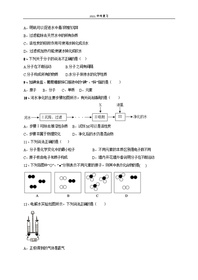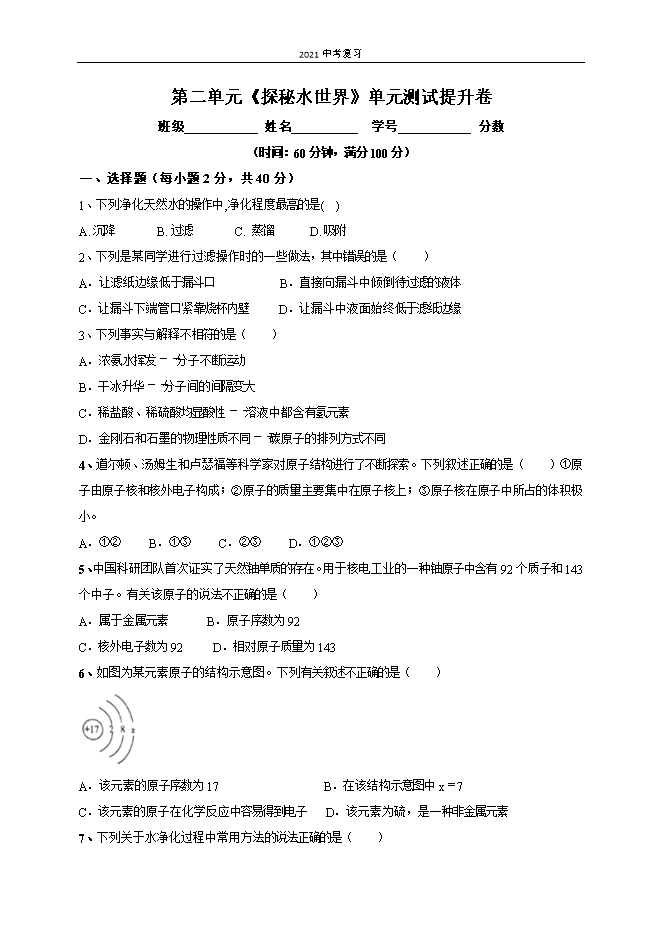 2021中考复习:鲁教版初中化学《第2单元 探秘水世界》单元测试提升卷(原卷版)