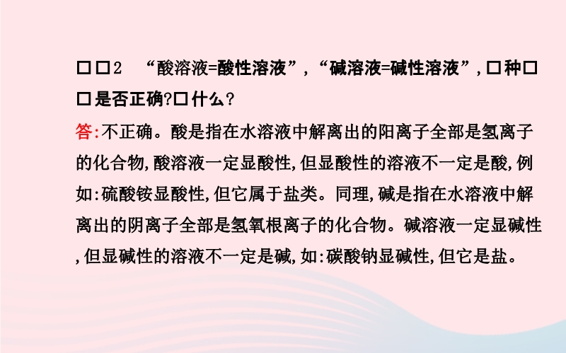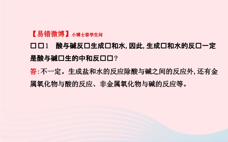 【内容简介】考点 一 酸和碱的中和反应 1.概念:_______作用生成_______的反应。2.实质:酸溶液中的__和碱溶液中的___结合生成___。3.应用:(1)改良土壤:农业上用_______改良酸性土壤。(2)处理废水:如用熟石灰中和硫酸厂的污水,化学方程式为:__________________________。(3)用于医药:用含_________的药物中和过多的胃酸,反应的化学方程式为__________________________。溶液pH的测定方法:在_______________上放一片pH试纸,用玻璃棒蘸取被测液体滴到_______上,把_______________与___________对比,即可得出被测溶液的pH,此法测得的pH为整数值。问题2 “酸溶液=酸性溶液”,“碱溶液=碱性溶液”,这种认识是否正确?为什么?答:不正确。酸是指在水溶液中解离出的阳离子全部是氢离子的化合物,酸溶液一定显酸性,但显酸性的溶液不一定是酸,例如:硫酸铵显酸性,但它属于盐类。同理,碱是指在水溶液中解离出的阴离子全部是氢氧根离子的化合物。碱溶液一定显碱性,但显碱性的溶液不一定是碱,如:碳酸钠显碱性,但它是盐......