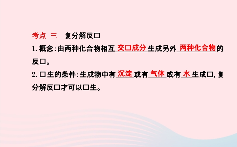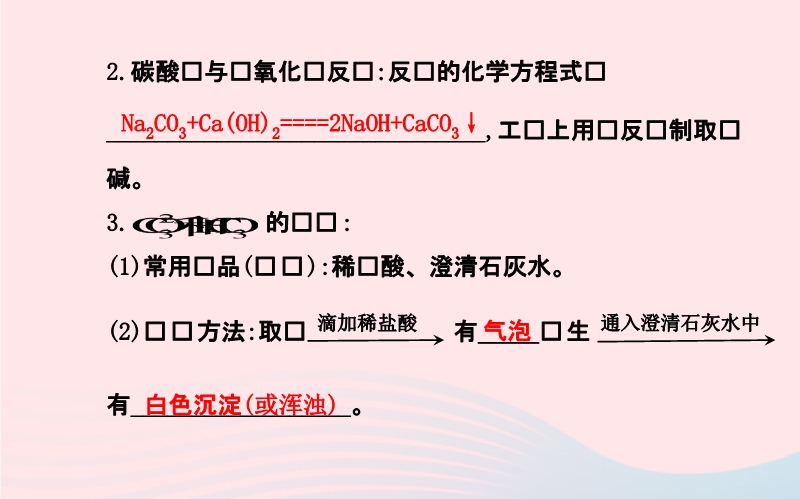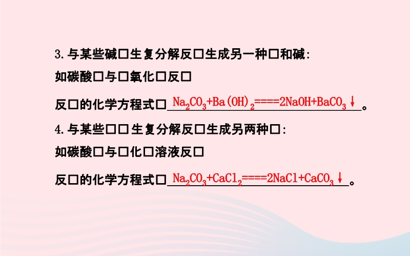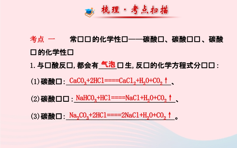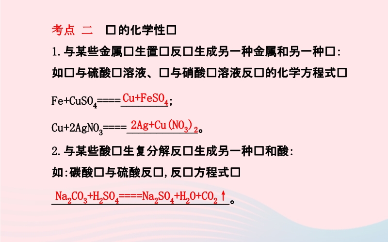 【内容简介】考点 一 常见盐的化学性质——碳酸钠、碳酸氢钠、碳酸钙的化学性质 1.与盐酸反应,都会有_____产生,反应的化学方程式分别为:(1)碳酸钙:_____________________________、(2)碳酸氢钠:____________________________、(3)碳酸钠:______________________________。考点 二 盐的化学性质 1.与某些金属发生置换反应生成另一种金属和另一种盐:如铁与硫酸铜溶液、铜与硝酸银溶液反应的化学方程式为Fe+CuSO4====________;Cu+2AgNO3====____________。2.与某些酸发生复分解反应生成另一种盐和酸:如:碳酸钠与硫酸反应,反应方程式为______________________________。3.与某些碱发生复分解反应生成另一种盐和碱:如碳酸钠与氢氧化钡反应反应的化学方程式为_______________________________。4.与某些盐发生复分解反应生成另两种盐:如碳酸钠与氯化钙溶液反应反应的化学方程式为_____________________________。考点 三 复分解反应 1.概念:由两种化合物相互_________生成另外___________的反应。2.发生的条件:生成物中有_____或有_____或有___生成时,复分解反应才可以发生。......