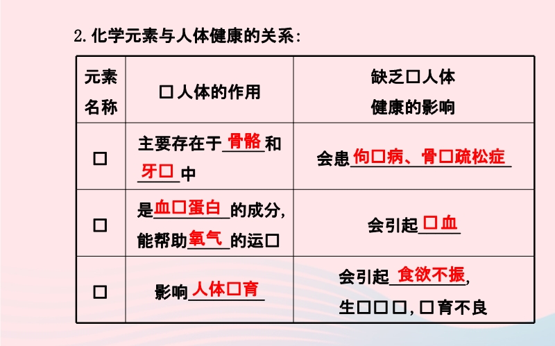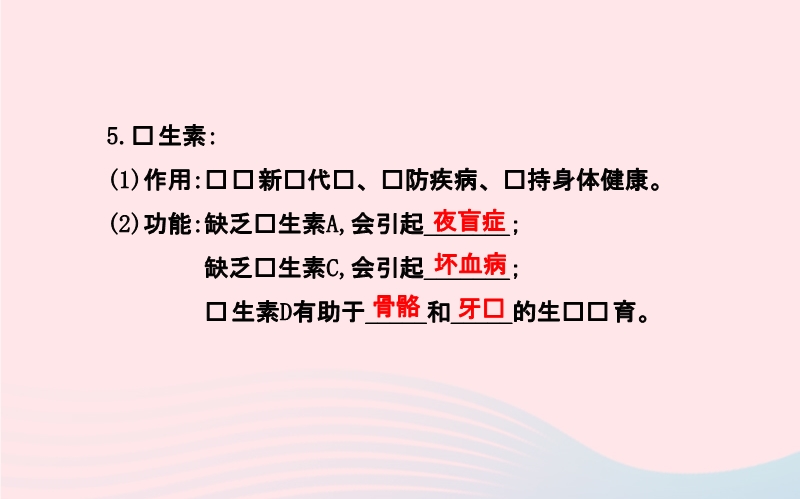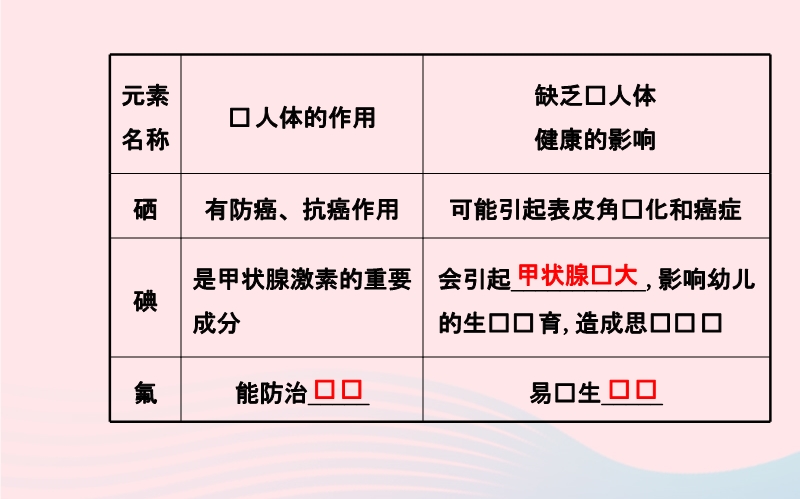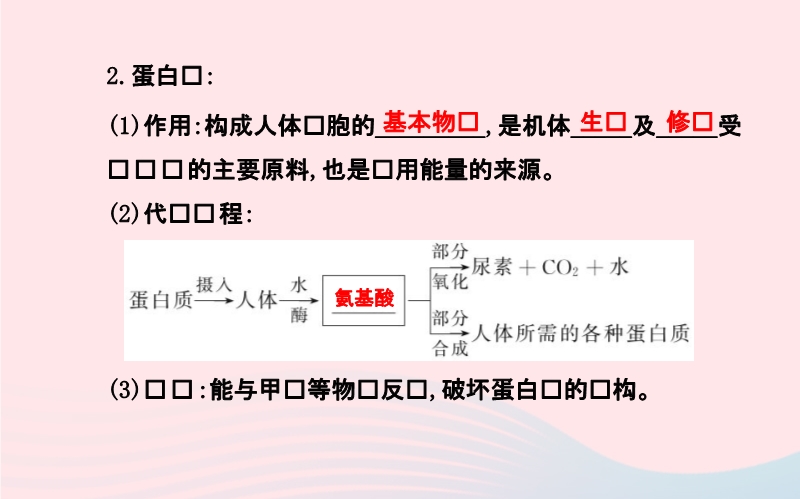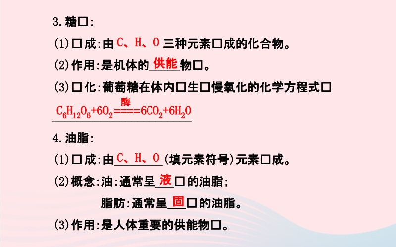 【内容简介】蛋白质:(1)作用:构成人体细胞的_________,是机体_____及_____受损组织的主要原料,也是备用能量的来源。(2)代谢过程:(3)变质:能与甲醛等物质反应,破坏蛋白质的结构。糖类:(1)组成:由________三种元素组成的化合物。(2)作用:是机体的_____物质。(3)转化:葡萄糖在体内发生缓慢氧化的化学方程式为_______________________4.油脂:(1)组成:由________(填元素符号)元素组成。(2)概念:油:通常呈___态的油脂; 脂肪:通常呈___态的油脂。(3)作用:是人体重要的供能物质。常量元素与微量元素:(1)常量元素:人体中含量超过______的元素,共有___种,含量最多的元素是___元素,含量最多的金属元素是___元素。(2)微量元素:含量低于______的元素,如铁、锌、碘等。维生素:(1)作用:调节新陈代谢、预防疾病、维持身体健康。(2)功能:缺乏维生素A,会引起_______; 缺乏维生素C,会引起_______; 维生素D有助于_____和_____的生长发育。......