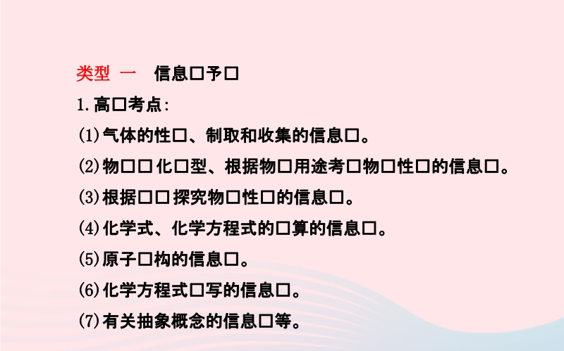 【内容简介】类型 一 信息给予题 1.高频考点:(1)气体的性质、制取和收集的信息题。(2)物质变化类型、根据物质用途考查物质性质的信息题。(3)根据实验探究物质性质的信息题。(4)化学式、化学方程式的计算的信息题。(5)原子结构的信息题。(6)化学方程式书写的信息题。(7)有关抽象概念的信息题等。2.解题规律:(1)正确认识该题型特点。①题型结构:一般由“新信息”和“问题”两部分组成。②信息来源:一般从高科技、生产生活、社会热点等方面取材,信息内容一般是物质的组成或结构、化学式、有关物质的性质、用途或使用注意事项、反应现象、化学方程式等。③答题要求:具有“高起点、低落点”的特点,即题目新颖,要求很高,但解决问题用到的知识往往从信息中能找到答案。(2)牢记注意事项。①认真审题,获取有用信息。②结合问题,正确处理信息。③根据信息,应变创新(创设新情境)。解题中要抓住信息特征,将新旧知识准确进行衔接,从而解决问题。即......