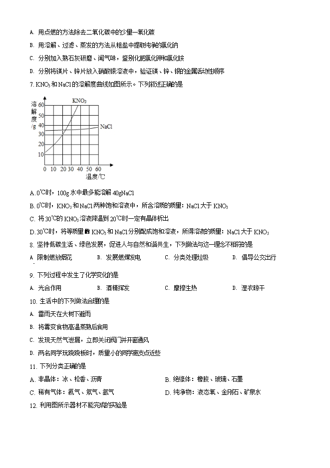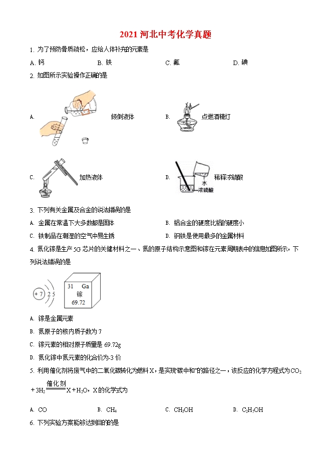 【内容简介】1. 为了预防骨质疏松,应给人体补充的元素是A. 钙 B. 铁 C. 氟 D. 碘2. 如图所示实验操作正确的是A. 倾倒液体 B. 点燃酒精灯C. 加热液体 D. 稀释浓硫酸3. 下列有关金属及合金的说法错误的是A. 金属在常温下大多数都是固体 B. 铝合金的硬度比铝的硬度小C. 铁制品在潮湿的空气中易生锈 D. 钢铁是使用最多的金属材料4. 氮化镓是生产5G芯片的关健材料之一、氮的原子结构示意图和镓在元素周期表中的信息如图所示,下列说法错误的是 A. 镓是金属元素B. 氮原子的核内质子数为7C. 镓元素的相对原子质量是69.72gD. 氮化镓中氮元素的化合价为-3价5. 利用催化剂将废气中的二氧化碳转化为燃料X,是实现“碳中和”的路径之一,该反应的化学方程式为CO2+3H2 X+H2O,X的化学式为A. CO B. CH4 C. CH3OH D. C2H5OH6. 下列实验方案能够达到目的的是A. 用点燃的方法除去二氧化碳中的少量一氧化碳B. 用溶解、过滤、蒸发的方法从粗盐中提取纯净的氯化钠C. 分别加入熟石灰研磨、闻气味,鉴别化肥氯化钾和氯化铵D. 分别将镁片、锌片放入硝酸银溶液中,验证镁、锌、银的金属活动性顺序7. KNO3和NaCl的溶解度曲线如图所示。下列叙述正确的是......