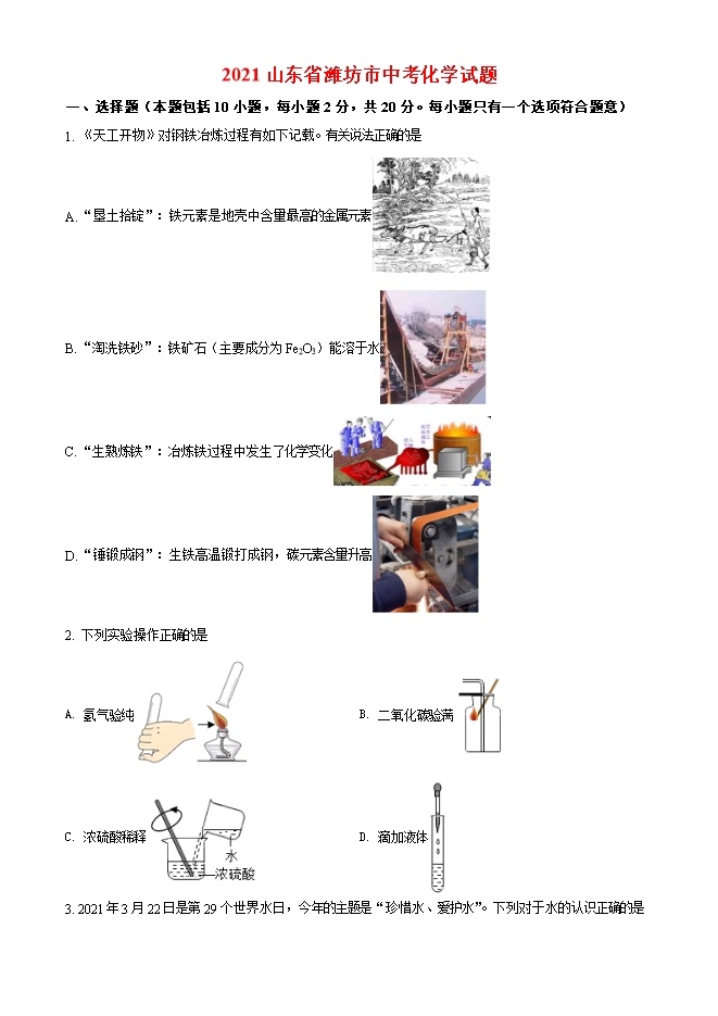 2021年山东省潍坊市中考化学试题(原卷版)