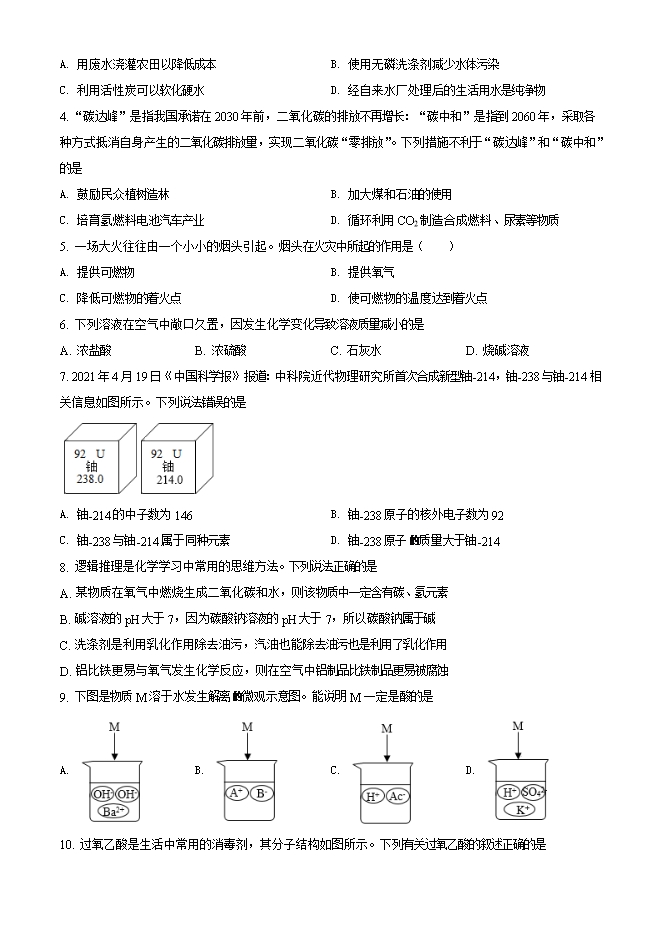 【内容简介】1. 《天工开物》对钢铁冶炼过程有如下记载。有关说法正确的是A. “垦土拾锭”:铁元素是地壳中含量最高的金属元素 B. “淘洗铁砂”:铁矿石(主要成分为Fe2O3)能溶于水 C. “生熟炼铁”:冶炼铁过程中发生了化学变化 D. “锤锻成钢”:生铁高温锻打成钢,碳元素含量升高 2. 下列实验操作正确的是A. 氢气验纯 B. 二氧化碳验满 C. 浓硫酸稀释 D. 滴加液体 3. 2021年3月22日是第29个世界水日,今年的主题是“珍惜水、爱护水”。下列对于水的认识正确的是A. 用废水浇灌农田以降低成本 B. 使用无磷洗涤剂减少水体污染C. 利用活性炭可以软化硬水 D. 经自来水厂处理后的生活用水是纯净物4. “碳达峰”是指我国承诺在2030年前,二氧化碳的排放不再增长:“碳中和”是指到2060年,采取各种方式抵消自身产生的二氧化碳排放量,实现二氧化碳“零排放”。下列措施不利于“碳达峰”和“碳中和”的是A. 鼓励民众植树造林 B. 加大煤和石油的使用C. 培育氢燃料电池汽车产业 D. 循环利用CO2制造合成燃料、尿素等物质5. 一场大火往往由一个小小的烟头引起。烟头在火灾中所起的作用是( )A. 提供可燃物 B. 提供氧气C. 降低可燃物的着火点 D. 使可燃物的温度达到着火点6. 下列溶液在空气中敞口久置,因发生化学变化导致溶液质量减小的是A. 浓盐酸 B. 浓硫酸 C. 石灰水 D. 烧碱溶液7. 2021年4月19日《中国科学报》报道:中科院近代物理研究所首次合成新型铀-214,铀-238与铀-214相关信息如图所示。下列说法错误的是......