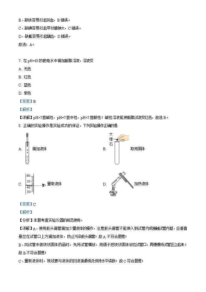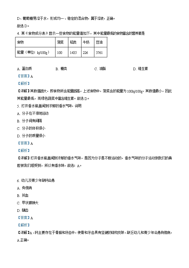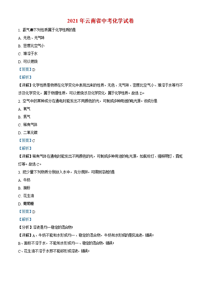【内容简介】1. 氢气 下列性质属于化学性质的是A. 无色、无气味B. 密度比空气小C. 难溶于水D. 可以燃烧【答案】D【解析】【详解】化学性质是物质在化学变化中表现出来的性质,无色、无气味、密度比空气小、难溶于水等均不涉及化学变化,属于物理性质,可以燃烧涉及化学变化,属于化学性质。故选D。2. 空气中的某种成分在通电时能发出不同颜色的光,可制成多种用途的电光源。该成分是A. 氧气B. 氮气C. 稀有气体D. 二氧化碳【答案】C【解析】【详解】稀有气体在通电时能发出不同颜色的光,可制成多种用途的电光源,如航标灯、强照明灯、霓虹灯等。故选C。3. 把少量下列物质分别放入水中,充分搅拌,可得到溶液的是A. 牛奶B. 面粉C. 花生油D. 葡萄糖【答案】D【解析】......
