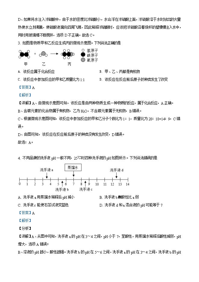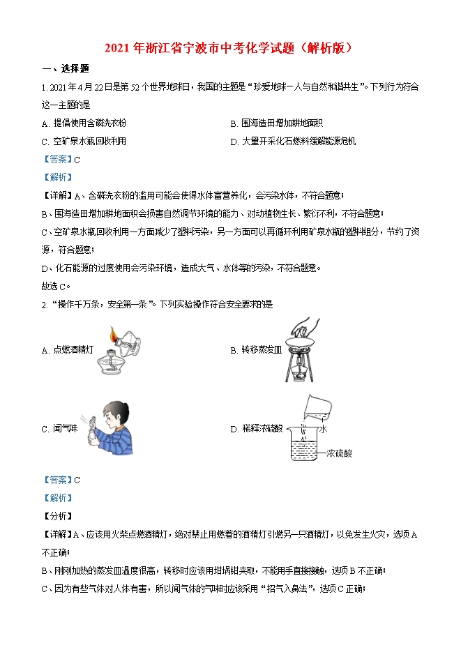 【内容简介】、选择题1. 2021年4月22日是第52个世界地球日,我国的主题是“珍爱地球—人与自然和谐共生”。下列行为符合这一主题的是A. 提倡使用含磷洗衣粉 B. 围海造田增加耕地面积C. 空矿泉水瓶回收利用 D. 大量开采化石燃料缓解能源危机【答案】C【解析】【详解】A、含磷洗衣粉的滥用可能会使得水体富营养化,会污染水体,不符合题意;B、围海造田增加耕地面积会损害自然调节环境的能力、对动植物生长、繁衍不利,不符合题意;C、空矿泉水瓶回收利用一方面减少了塑料污染,另一方面可以再循环利用矿泉水瓶的塑料组分,节约了资源,符合题意;D、化石能源的过度使用会污染环境,造成大气、水体等的污染,不符合题意。故选C。2. “操作千万条,安全第一条”。下列实验操作符合安全要求的是A. 点燃酒精灯 B. 转移蒸发皿 C. 闻气味 D. 稀释浓硫酸 【答案】C【解析】【分析】【详解】A、应该用火柴点燃酒精灯,绝对禁止用燃着的酒精灯引燃另一只酒精灯,以免发生火灾,选项A不正确;B、刚刚加热的蒸发皿温度很高,转移时应该用坩埚钳夹取,不能用手直接接触,选项B不正确;C、因为有些气体对人体有害,所以闻气体的气味时应该采用“招气入鼻法”,选项C正确;D、如果将水注入浓硫酸中,由于水的密度比浓硫酸小,水会浮在浓硫酸上面,浓硫酸溶于水时放出的大量热使水立刻沸腾,使硫酸液滴向四周飞溅,因此稀释浓硫酸时,应该把浓硫酸沿着烧杯的壁慢慢注入水中,同时用玻璃棒不断搅拌,选项D不正确。故选C。3. 如图是物质甲和乙反应生成丙的微观示意图。下列说法正确的是......