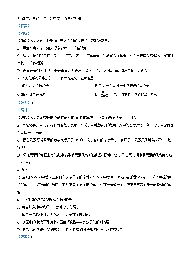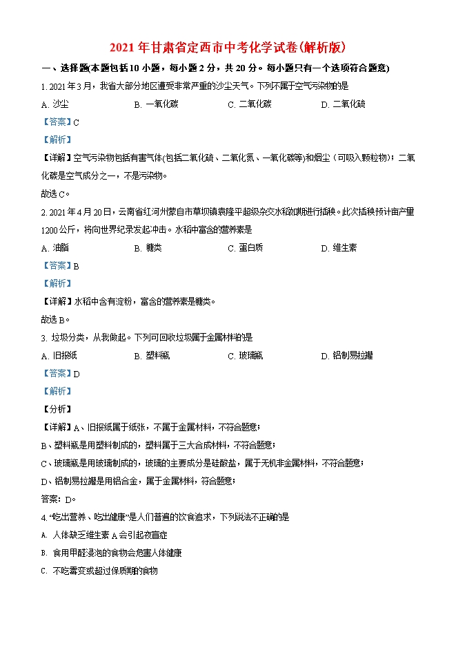 【内容简介】一、选择题(本题包括10小题,每小题2分,共20分。每小题只有一个选项符合题意)1. 2021年3月,我省大部分地区遭受非常严重的沙尘天气。下列不属于空气污染物的是A. 沙尘 B. 一氧化碳 C. 二氧化碳 D. 二氧化硫【答案】C【解析】【详解】空气污染物包括有害气体(包括二氧化硫、二氧化氮、一氧化碳等)和烟尘(可吸入颗粒物);二氧化碳是空气成分之一,不是污染物。故选C。2. 2021年4月20日,云南省红河州蒙自市草坝镇袁隆平超级杂交水稻如期进行插秧。此次插秧预计亩产量1200公斤,将向世界纪录发起冲击。水稻中富含的营养素是A. 油脂 B. 糖类 C. 蛋白质 D. 维生素【答案】B【解析】【详解】水稻中含有淀粉,富含的营养素是糖类。故选B。3. 垃圾分类,从我做起。下列可回收垃圾属于金属材料的是A. 旧报纸 B. 塑料瓶 C. 玻璃瓶 D. 铝制易拉罐【答案】D【解析】【分析】【详解】A、旧报纸属于纸张,不属于金属材料,不符合题意;B、塑料瓶是用塑料制成的,塑料属于三大合成材料,不符合题意;C、玻璃瓶是用玻璃制成的,玻璃的主要成分是硅酸盐,属于无机非金属材料,不符合题意;D、铝制易拉罐是用铝合金,属于金属材料,符合题意;答案:D。4. “吃出营养、吃出健康”是人们普遍的饮食追求,下列说法不正确的是A. 人体缺乏维生素A会引起夜盲症B. 食用甲醛浸泡的食物会危害人体健康C. 不吃霉变或超过保质期的食物......