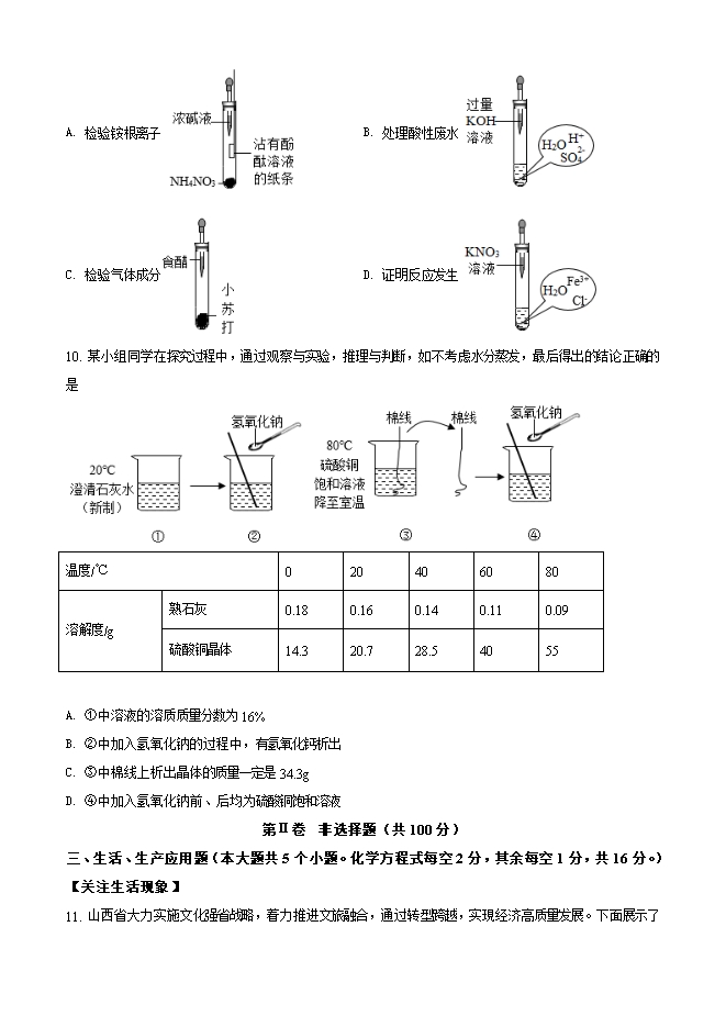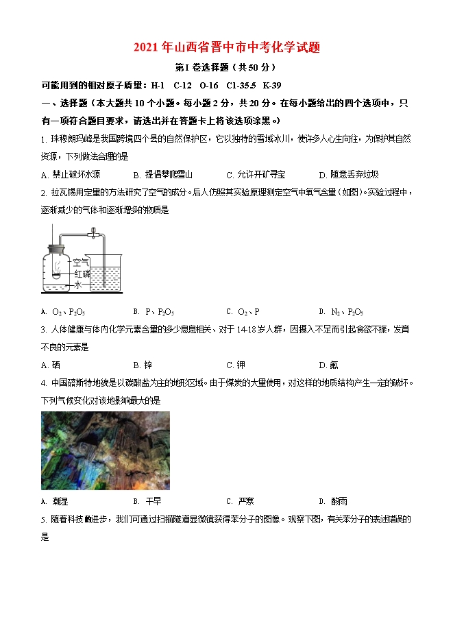 【内容简介】1. 珠穆朗玛峰是我国跨境四个县的自然保护区,它以独特的雪域冰川,使许多人心生向往,为保护其自然资源,下列做法合理的是A. 禁止破坏水源 B. 提倡攀爬雪山 C. 允许开矿寻宝 D. 随意丢弃垃圾2. 拉瓦锡用定量的方法研究了空气的成分。后人仿照其实验原理测定空气中氧气含量(如图)。实验过程中,逐渐减少的气体和逐渐增多的物质是 A. O2、P2O5 B. P、P2O5 C. O2、P D. N2、P2O53. 人体健康与体内化学元素含量的多少息息相关、对于14-18岁人群,因摄入不足而引起食欲不振,发育不良的元素是A. 硒 B. 锌 C. 钾 D. 氟4. 中国碦斯特地貌是以碳酸盐为主的地形区域。由于煤炭的大量使用,对这样的地质结构产生一定的破坏。下列气候变化对该地影响最大的是 A. 潮湿 B. 干早 C. 严寒 D. 酸雨5. 随着科技 进步,我们可通过扫描隧道显微镜获得苯分子的图像。观察下图,有关苯分子的表述错误的是 A. 它在不断运动 B. 它体积很小 C. 分子间有间隔 D. 它真实存在6. 5月15日,中国天问一号探测器成功着陆火星。火星上有峡谷山群、尘埃风暴,昼夜温差较大。安全着陆无需考虑的因素是 ......