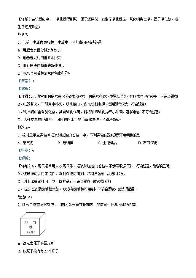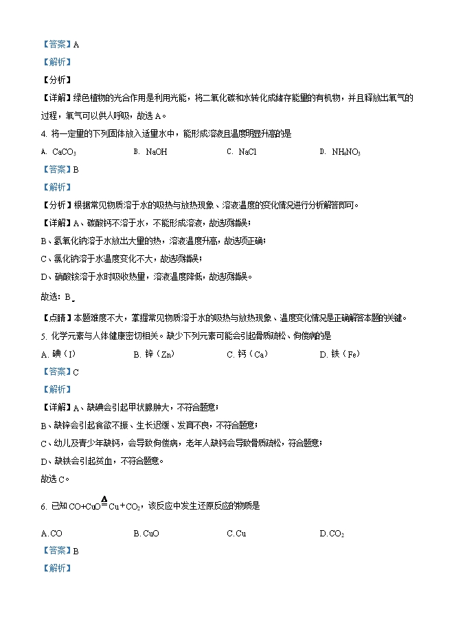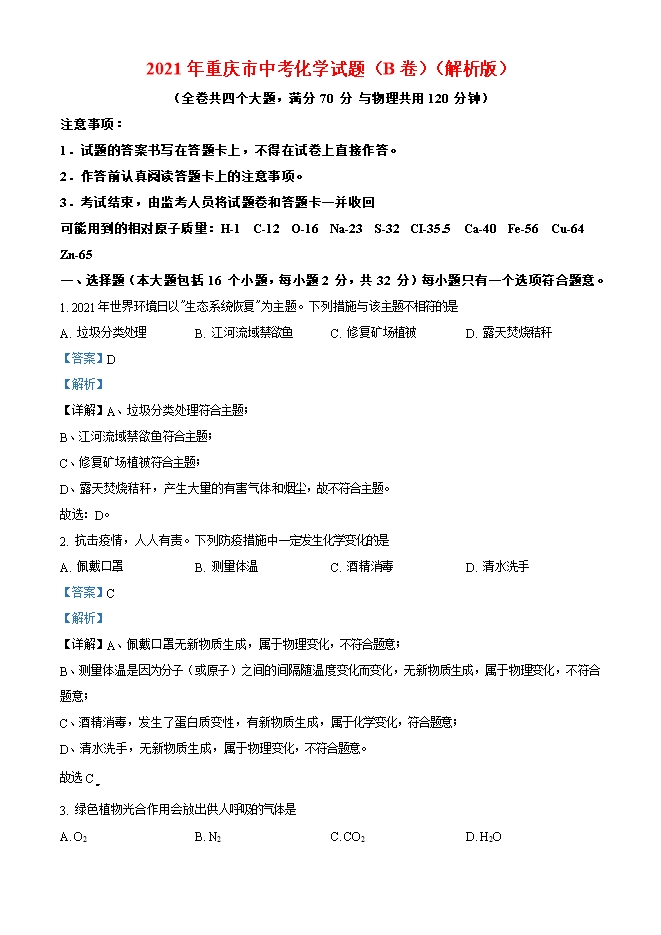【内容简介】一、选择题(本大题包括 16 个小题,每小题2 分,共 32 分)每小题只有一个选项符合题意。1. 2021年世界环境日以"生态系统恢复"为主题。下列措施与该主题不相符的是A. 垃圾分类处理 B. 江河流域禁欲鱼 C. 修复矿场植被 D. 露天焚烧秸秆【答案】D【解析】【详解】A、垃圾分类处理符合主题;B、江河流域禁欲鱼符合主题;C、修复矿场植被符合主题;D、露天焚烧秸秆,产生大量的有害气体和烟尘,故不符合主题。故选:D。2. 抗击疫情,人人有责。下列防疫措施中一定发生化学变化的是A. 佩戴口罩 B. 测量体温 C. 酒精消毒 D. 清水洗手【答案】C【解析】【详解】A、佩戴口罩无新物质生成,属于物理变化,不符合题意;B、测量体温是因为分子(或原子)之间的间隔随温度变化而变化,无新物质生成,属于物理变化,不符合题意;C、酒精消毒,发生了蛋白质变性,有新物质生成,属于化学变化,符合题意;D、清水洗手,无新物质生成,属于物理变化,不符合题意。故选C 3. 绿色植物光合作用会放出供人呼吸的气体是A. O2 B. N2 C. CO2 D. H2O【答案】A【解析】【分析】【详解】绿色植物的光合作用是利用光能,将二氧化碳和水转化成储存能量的有机物,并且释放出氧气的过程,氧气可以供人呼吸,故选A。......