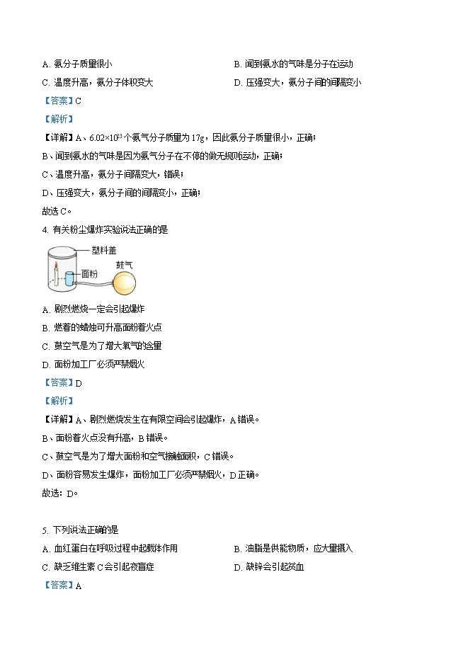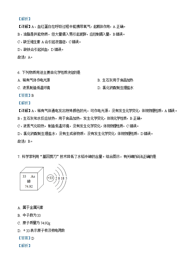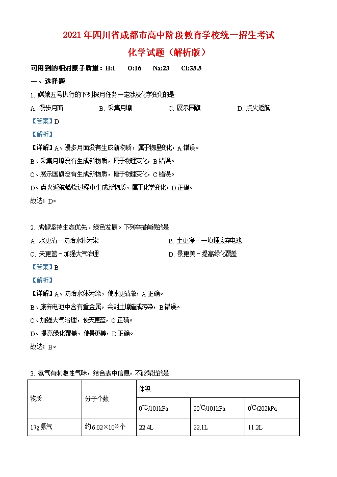 【内容简介】一、选择题1. 嫦娥五号执行的下列探月任务一定涉及化学变化的是A. 漫步月面 B. 采集月壤 C. 展示国旗 D. 点火返航【答案】D【解析】【详解】A、漫步月面没有生成新物质,属于物理变化,A错误。B、采集月壤没有生成新物质,属于物理变化,B错误。C、展示国旗没有生成新物质,属于物理变化,C错误。D、点火返航燃烧过程中生成新物质,属于化学变化,D正确。故选:D。2. 成都坚持生态优先、绿色发展。下列举措有误的是A. 水更清-防治水体污染 B. 土更净-一填埋废弃电池C. 天更蓝-加强大气治理 D. 景更美-提高绿化覆盖【答案】B【解析】【详解】A、防治水体污染,使水更清澈,A正确。B、废弃电池中含有重金属,会对土壤造成污染,B错误。C、加强大气治理,使天更蓝,C正确。D、提高绿化覆盖,使景更美,D正确。故选:B。.....