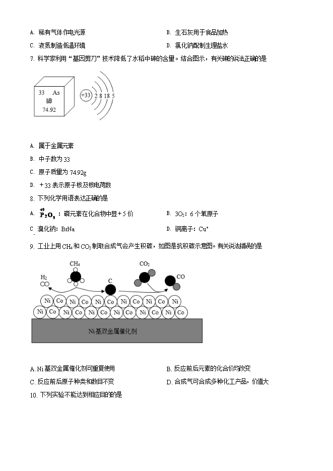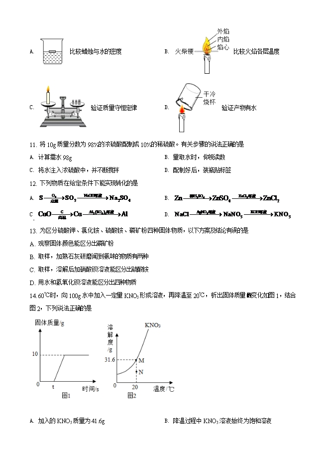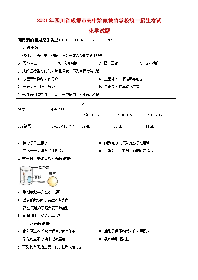 【内容简介】一、选择题1. 嫦娥五号执行的下列探月任务一定涉及化学变化的是A. 漫步月面 B. 采集月壤 C. 展示国旗 D. 点火返航2. 成都坚持生态优先、绿色发展。下列举措有误的是A. 水更清-防治水体污染 B. 土更净-一填埋废弃电池C. 天更蓝-加强大气治理 D. 景更美-提高绿化覆盖3. 氨气有刺激性气味,结合表中信息,不能得出的是物质 分子个数 体积 0℃/101kPa 20℃/101kPa 0℃/202kPa17g氨气 约6.02×1023个 22.4L 22.1L 11.2LA. 氨分子质量很小 B. 闻到氨水的气味是分子在运动C. 温度升高,氨分子体积变大 D. 压强变大,氨分子间的间隔变小4. 有关粉尘爆炸实验说法正确的是 ......