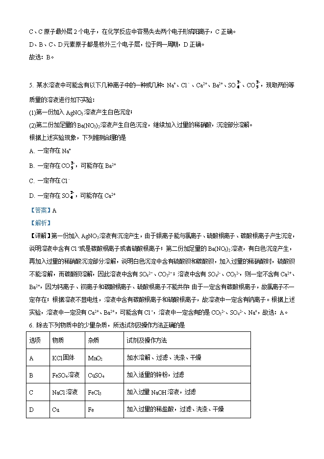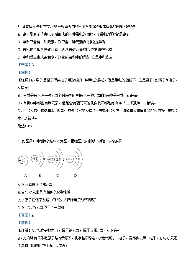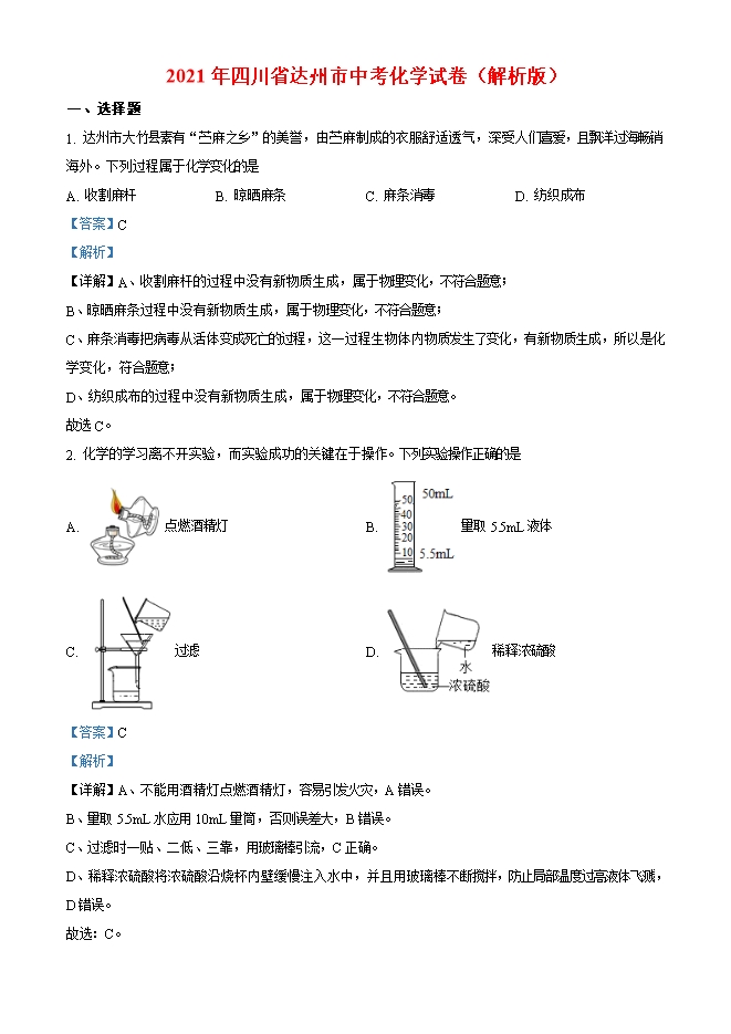 【内容简介】1. 达州市大竹县素有“苎麻之乡”的美誉,由苎麻制成的衣服舒适透气,深受人们喜爱,且飘洋过海畅销海外。下列过程属于化学变化的是A. 收割麻杆 B. 晾晒麻条 C. 麻条消毒 D. 纺织成布【答案】C【解析】【详解】A、收割麻杆的过程中没有新物质生成,属于物理变化,不符合题意;B、晾晒麻条过程中没有新物质生成,属于物理变化,不符合题意;C、麻条消毒把病毒从活体变成死亡的过程,这一过程生物体内物质发生了变化,有新物质生成,所以是化学变化,符合题意;D、纺织成布的过程中没有新物质生成,属于物理变化,不符合题意。故选C。2. 化学的学习离不开实验,而实验成功的关键在于操作。下列实验操作正确的是A. 点燃酒精灯 B. 量取5.5mL液体C. 过滤 D. 稀释浓硫酸【答案】C【解析】【详解】A、不能用酒精灯点燃酒精灯,容易引发火灾,A错误。B、量取5.5mL水应用10mL量筒,否则误差大,B错误。C、过滤时一贴、二低、三靠,用玻璃棒引流,C正确。D、稀释浓硫酸将浓硫酸沿烧杯内壁缓慢注入水中,并且用玻璃棒不断搅拌,防止局部温度过高液体飞溅,D错误。故选:C。3. 基本概念是化学学习的一项重要内容。下列对某些基本概念的理解正确的是A. 离子是原子得失电子后形成的一种带电的微粒,则带电的微粒就是离子B. 单质只含有一种元素,则只含一种元素的纯净物是单质C. 有机物中都含有碳元素,则含有碳元素的化合物都是有机物D. 中和反应生成盐和水,则生成盐和水的反应一定是中和反应【答案】B【解析】【详解】A、离子是原子得失电子后形成的一种带电的微粒,但是带电的微粒不一定是离子,如质子和电子,A错误。B、单质是只含有一种元素的纯净物,则只含一种元素的纯净物是单质,B正确。C、有机物中都含有碳元素,但是含有碳元素的化合物不都是有机物,如二氧化碳,C错误。D、中和反应生成盐和水,但是生成盐和水的反应不一定是中和反应,如酸和金属氧化物的反应就生成盐和水,D错误。故选:B。......