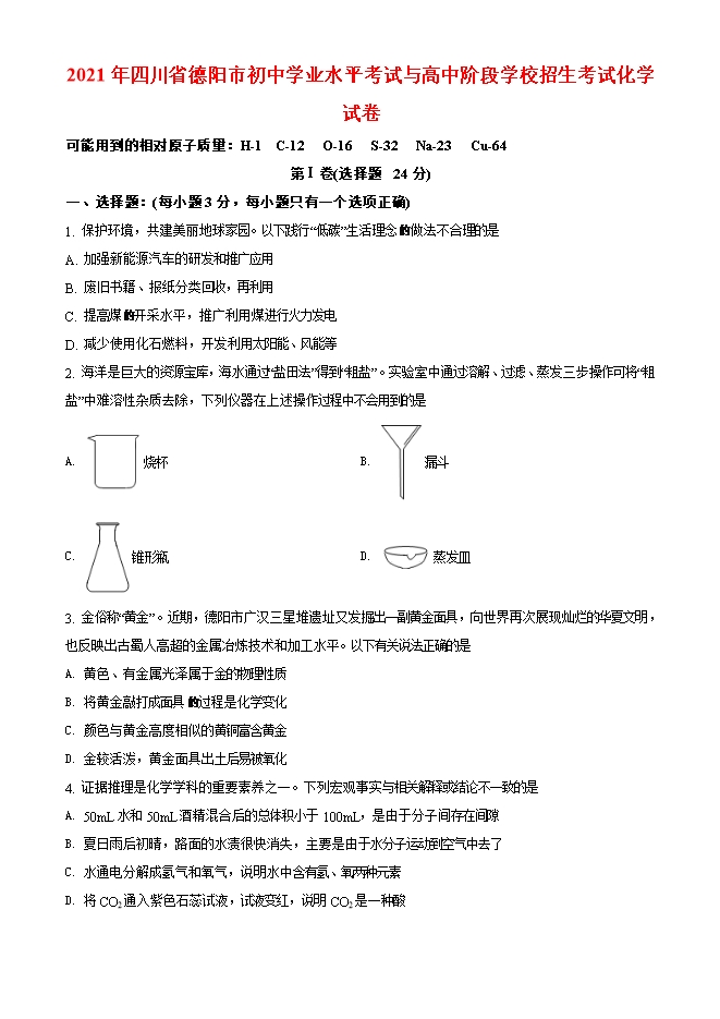 【内容简介】一、选择题:(每小题3分,每小题只有一个选项正确)1. 保护环境,共建美丽地球家园。以下践行“低碳”生活理念 做法不合理的是A. 加强新能源汽车的研发和推广应用B. 废旧书籍、报纸分类回收,再利用C. 提高煤 开采水平,推广利用煤进行火力发电D. 减少使用化石燃料,开发利用太阳能、风能等2. 海洋是巨大的资源宝库,海水通过“盐田法”得到“粗盐”。实验室中通过溶解、过滤、蒸发三步操作可将“粗盐”中难溶性杂质去除,下列仪器在上述操作过程中不会用到的是A. 烧杯 B. 漏斗C. 锥形瓶 D. 蒸发皿3. 金俗称“黄金”。近期,德阳市广汉三星堆遗址又发掘出一副黄金面具,向世界再次展现灿烂的华夏文明,也反映出古蜀人高超的金属冶炼技术和加工水平。以下有关说法正确的是A. 黄色、有金属光泽属于金的物理性质B. 将黄金敲打成面具 过程是化学变化C. 颜色与黄金高度相似的黄铜富含黄金D. 金较活泼,黄金面具出土后易被氧化4. 证据推理是化学学科的重要素养之一。下列宏观事实与相关解释或结论不一致的是A. 50mL水和50mL酒精混合后的总体积小于100mL,是由于分子间存在间隙B. 夏日雨后初晴,路面的水渍很快消失,主要是由于水分子运动到空气中去了C. 水通电分解成氢气和氧气,说明水中含有氢、氧两种元素D. 将CO2通入紫色石蕊试液,试液变红,说明CO2是一种酸......